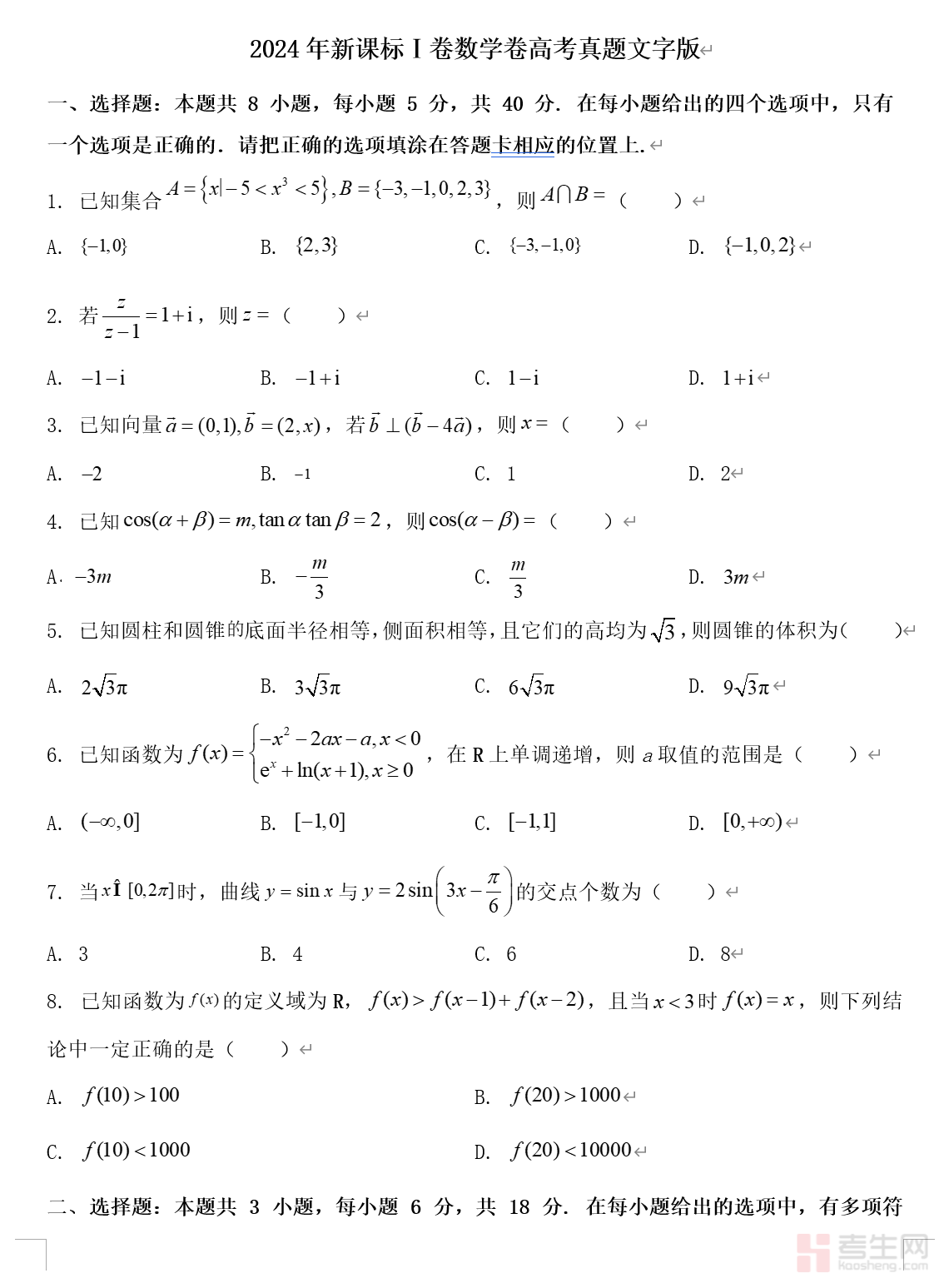 2024年新课标Ⅰ卷数学卷高考真题文字版