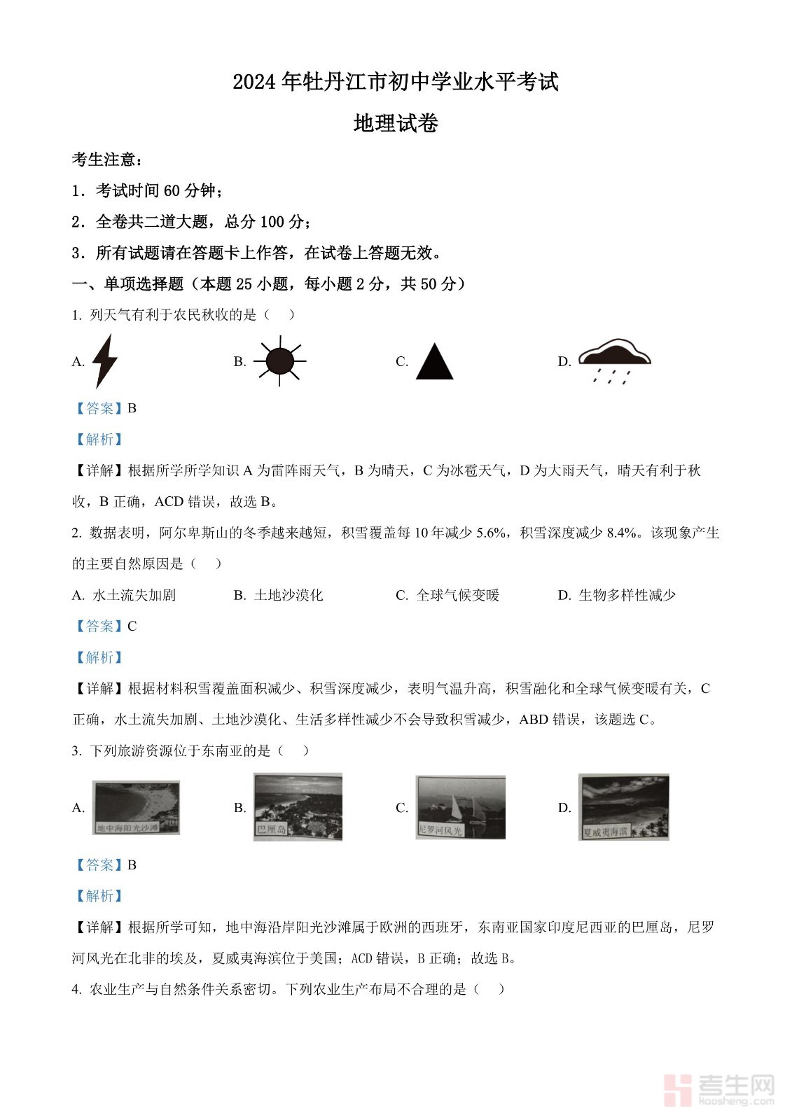 2024年黑龙江省牡丹江市中考地理试题(解析版)