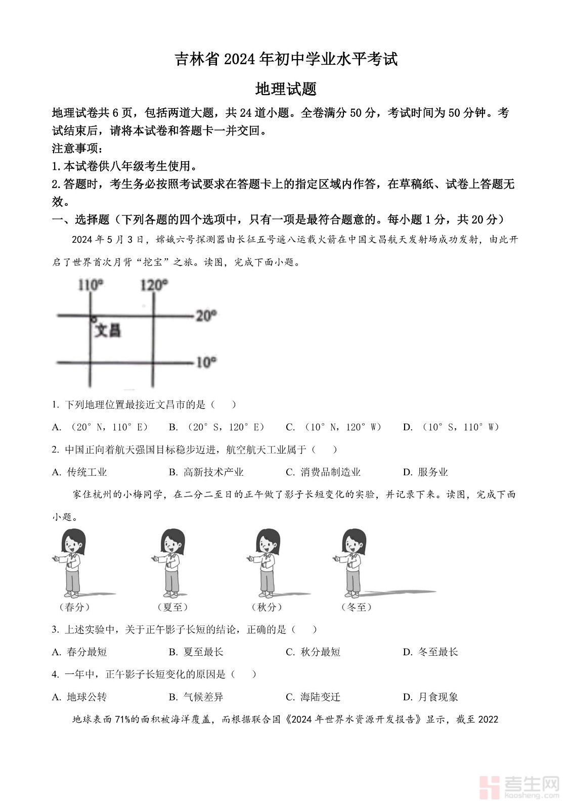 2024年吉林省中考地理试题(原卷版)