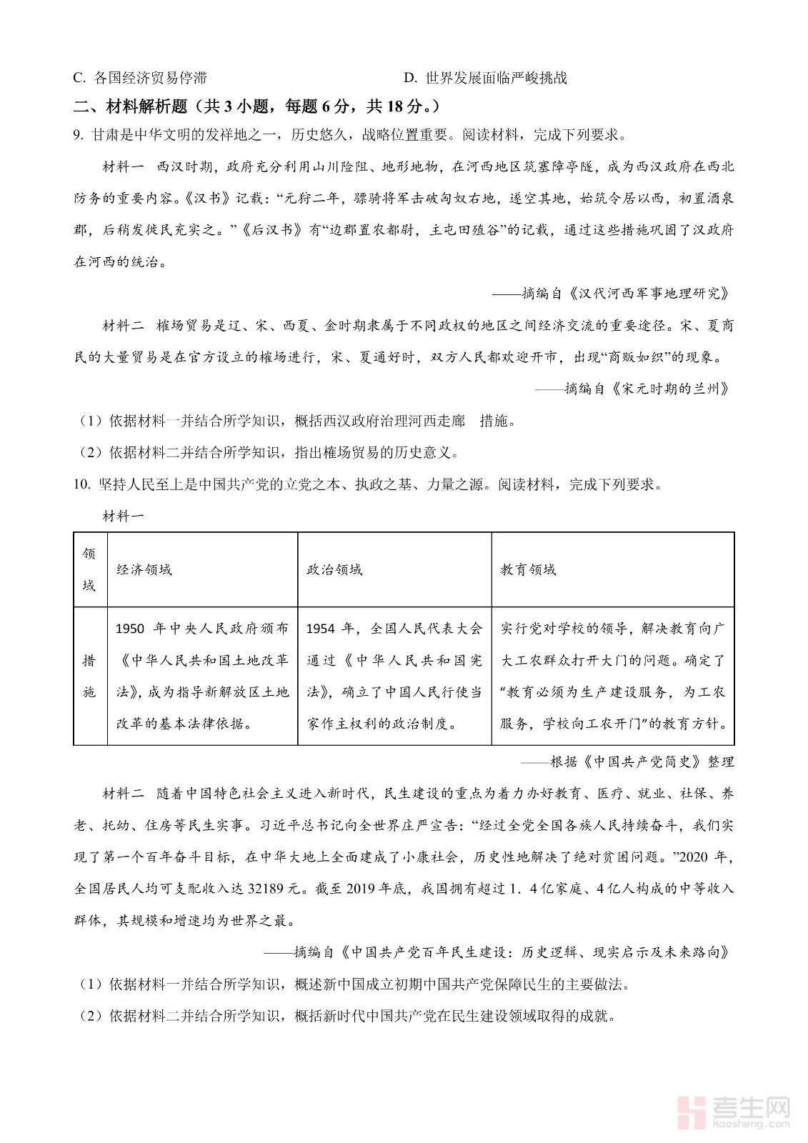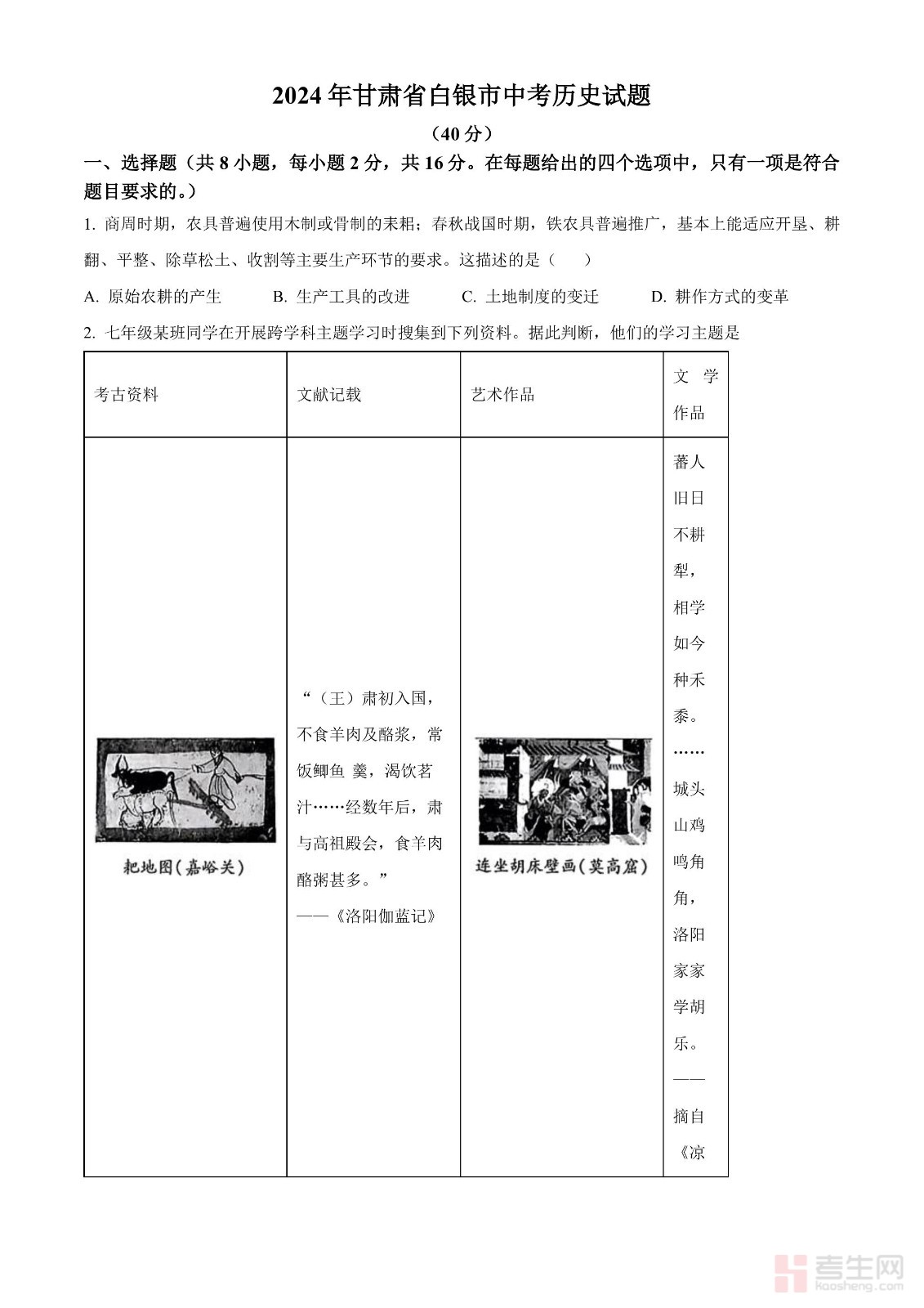 2024年贵州省黔东南州中考历史真题(原卷版)