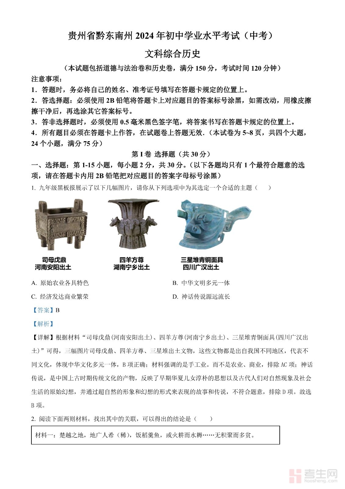 2024年贵州省黔东南州中考历史真题(解析版)