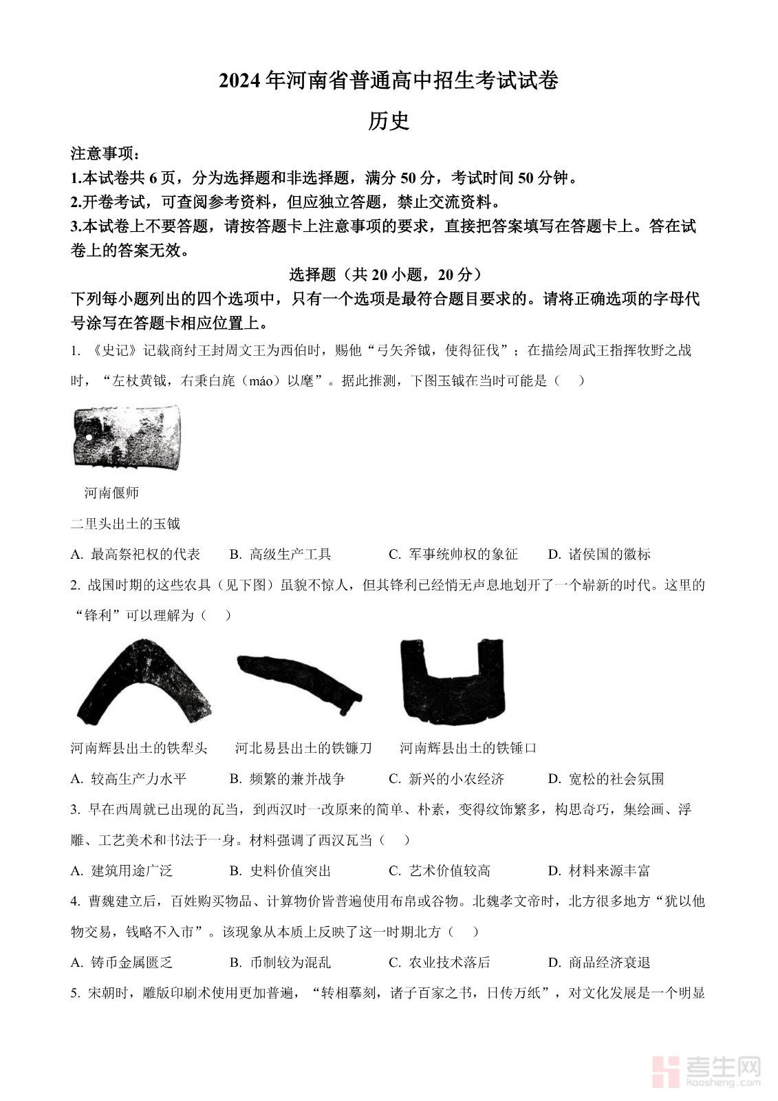 2024年河南省中考历史试题(原卷版)