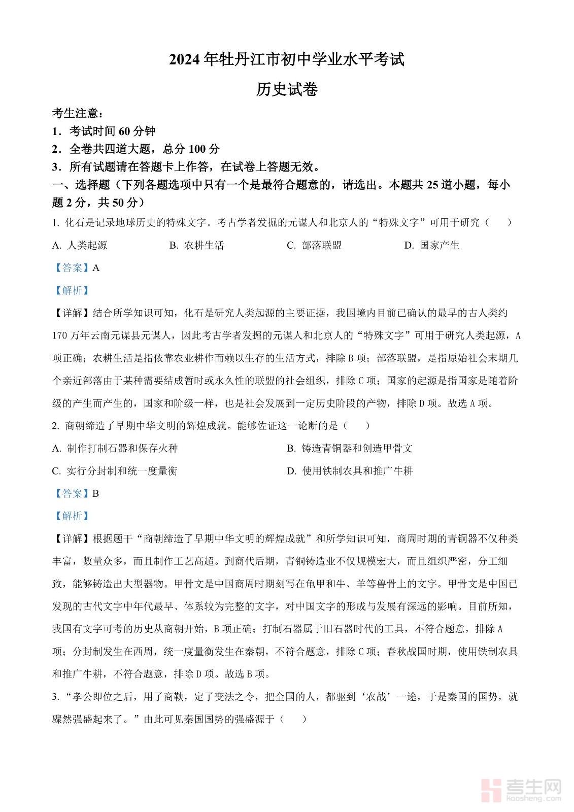 2024年黑龙江省牡丹江市中考历史真题(解析版)