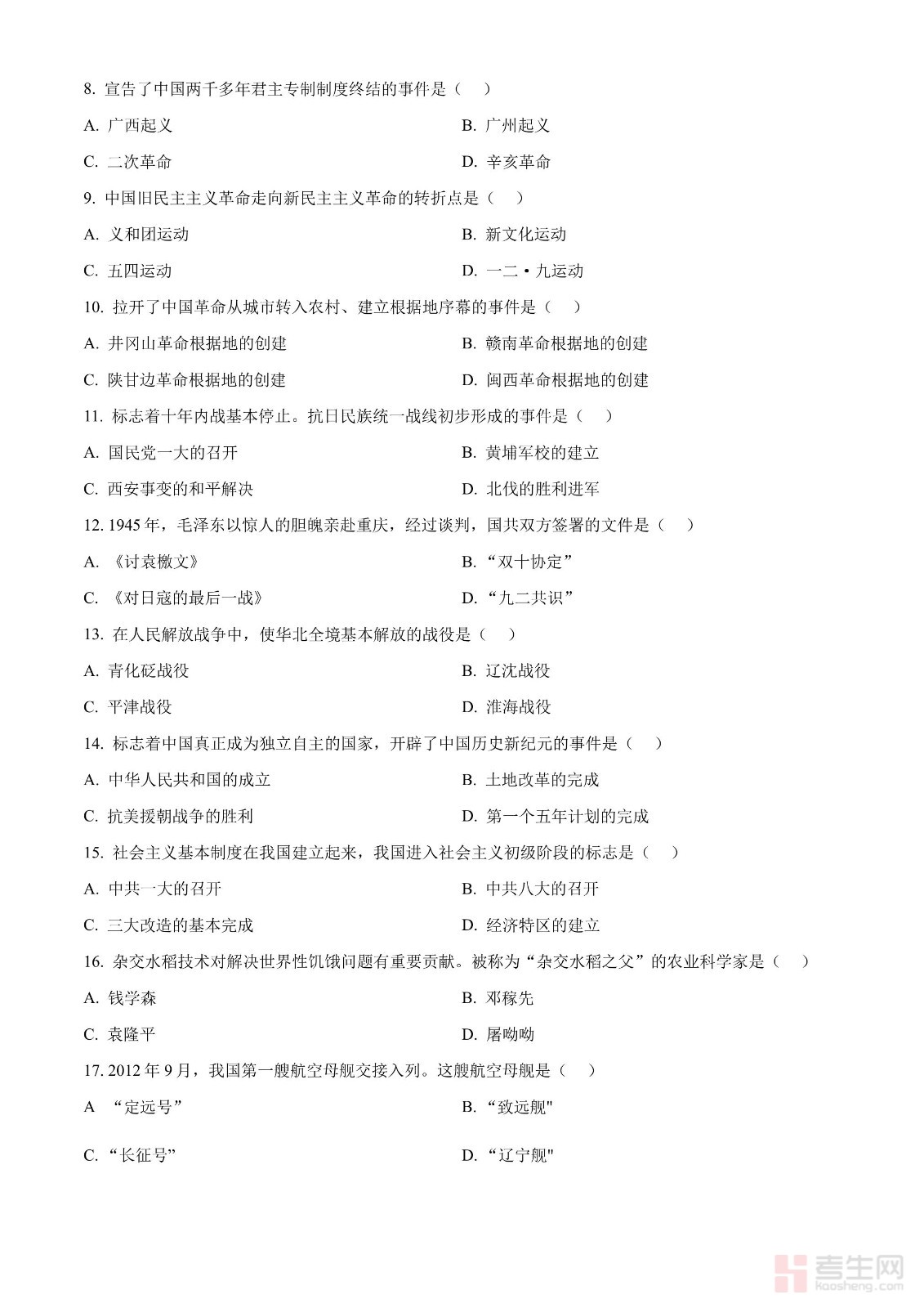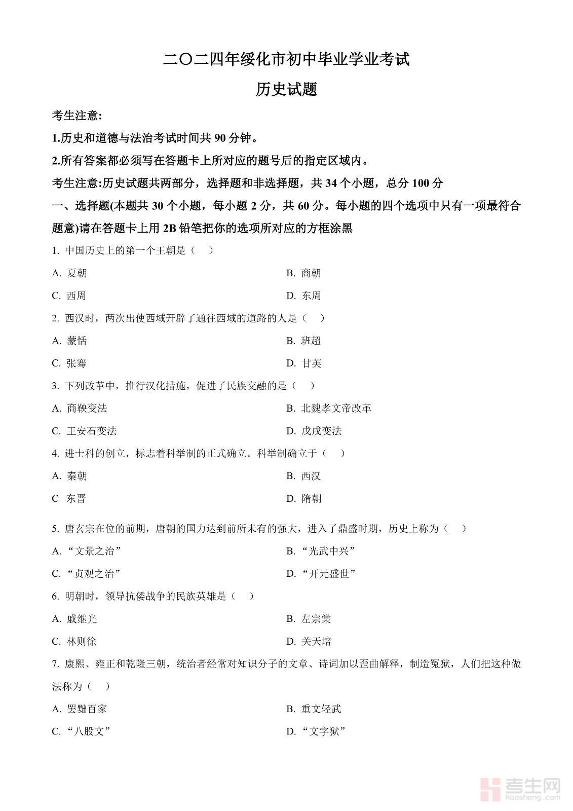 2024年黑龙江省绥化市中考历史真题(原卷版)