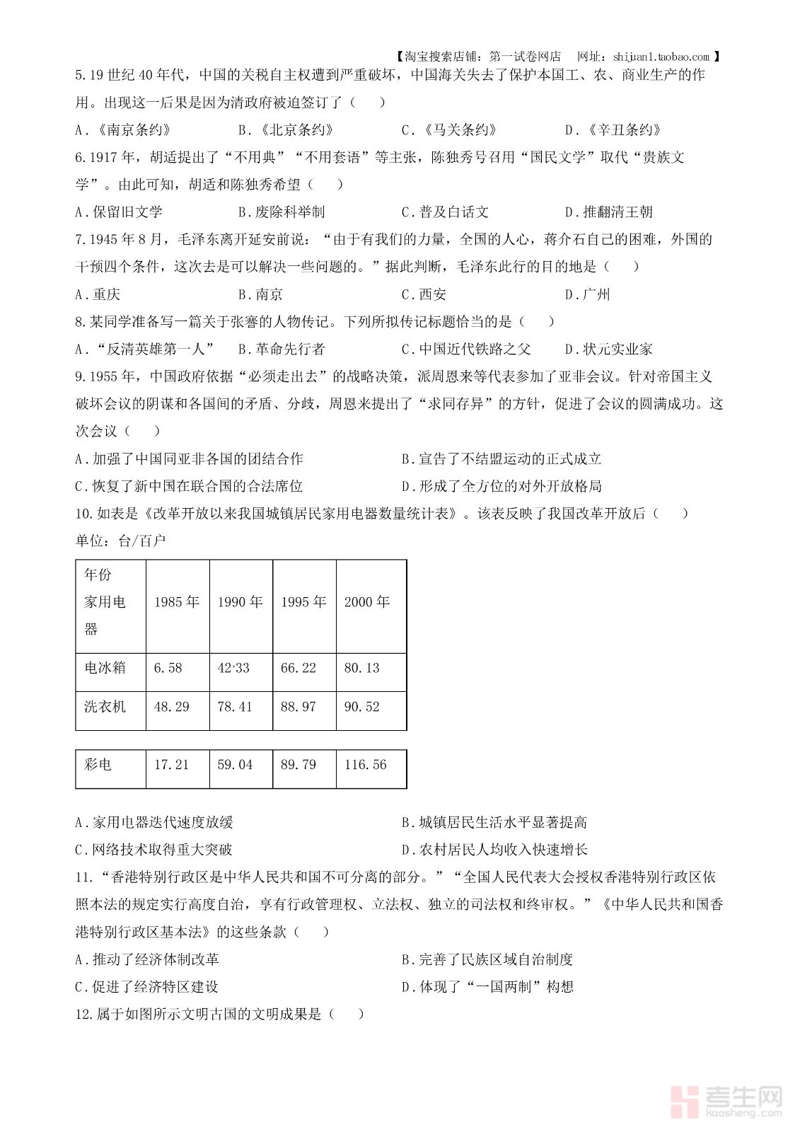2024年云南省中考历史真题(原卷版)