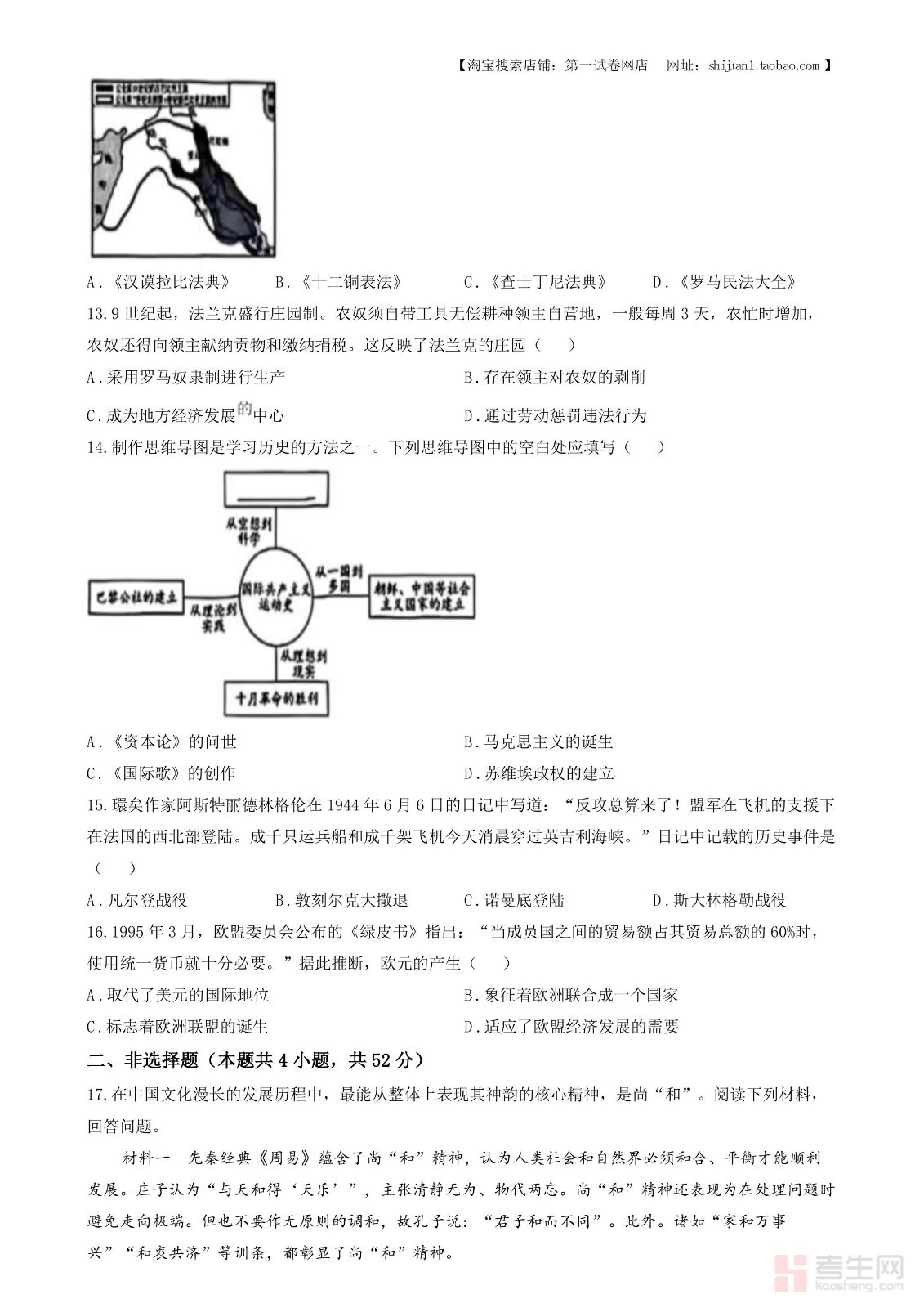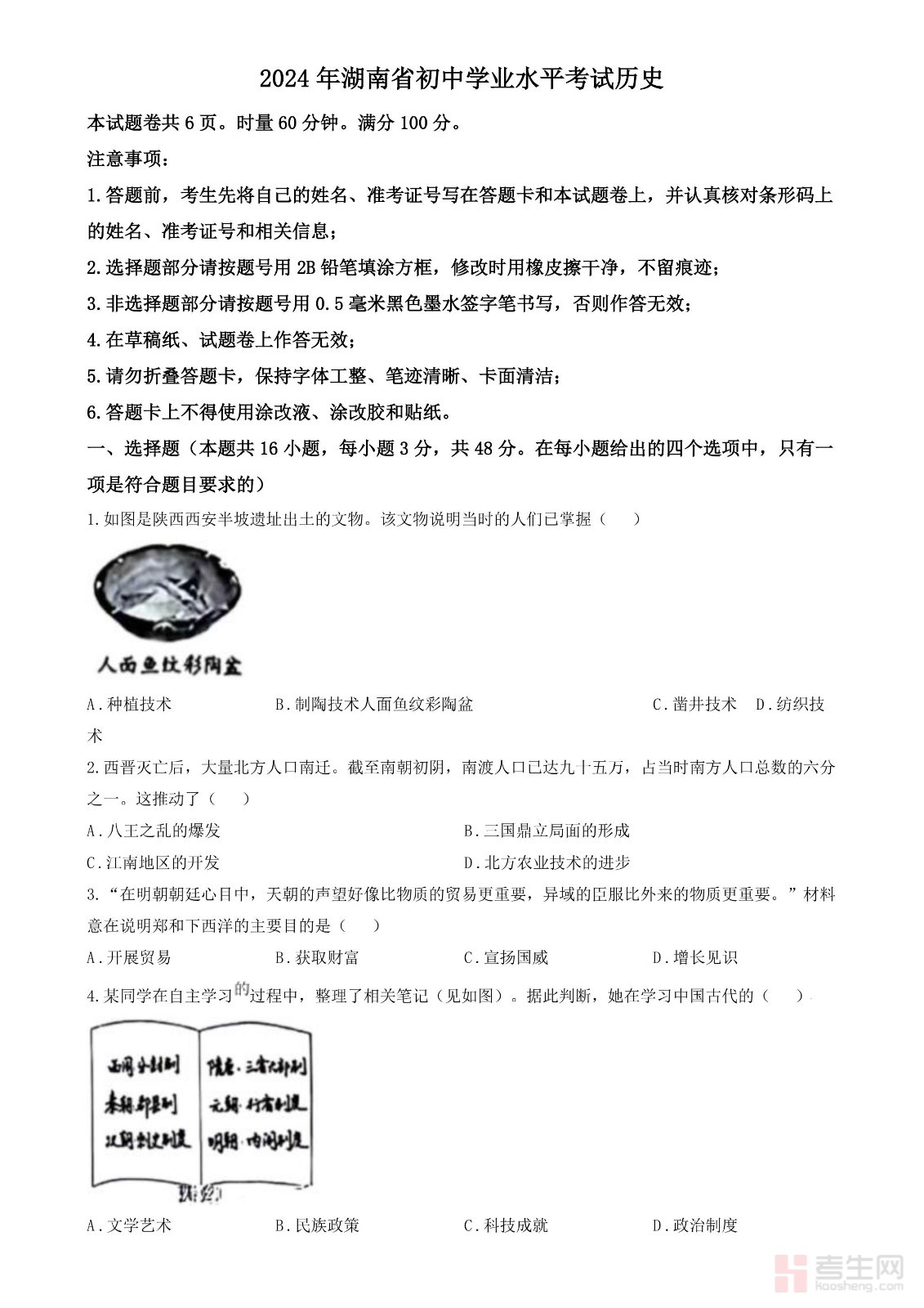 2024年湖南省中考历史试题(原卷版)