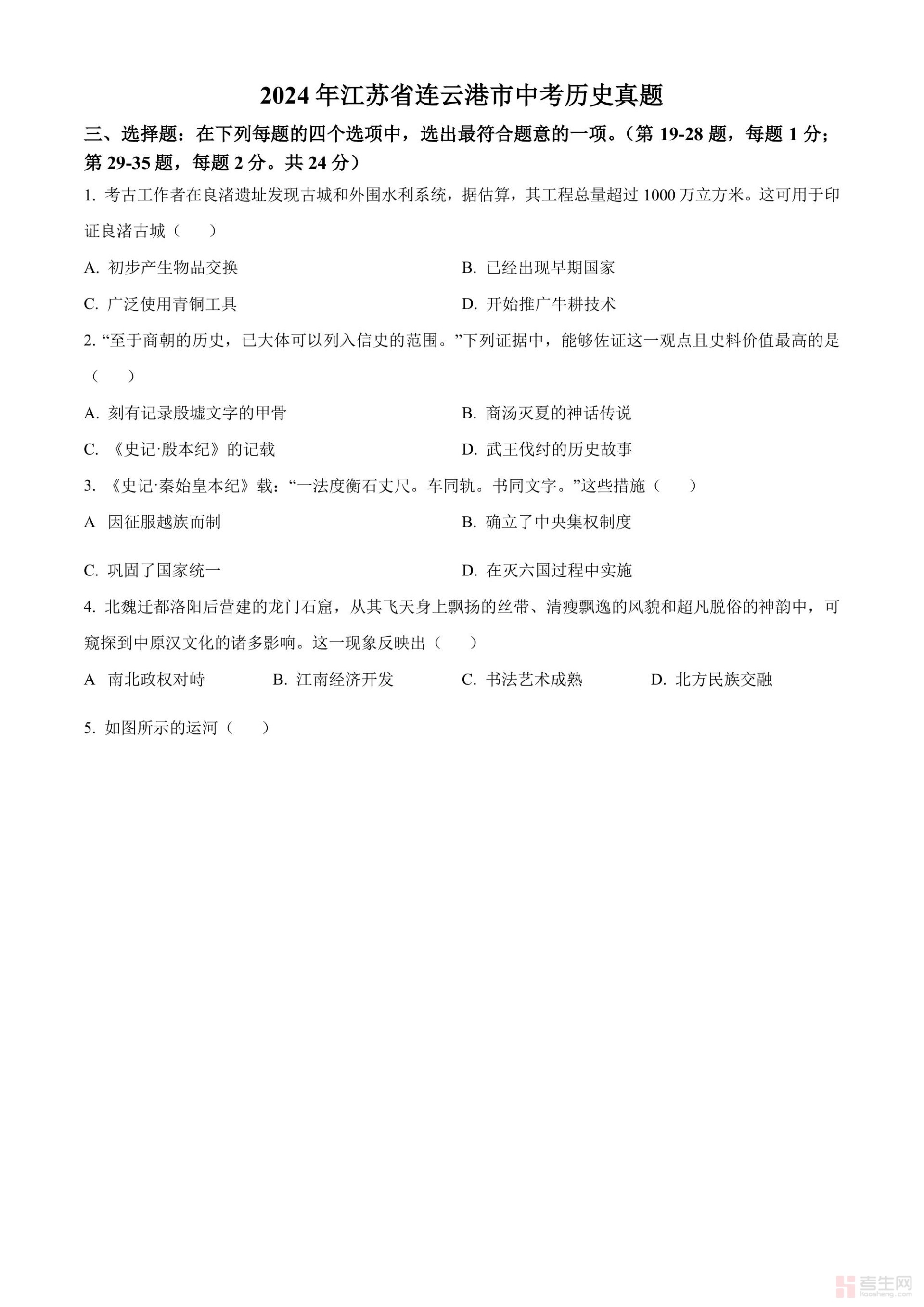 2024年江苏省连云港市中考历史真题(原卷版)