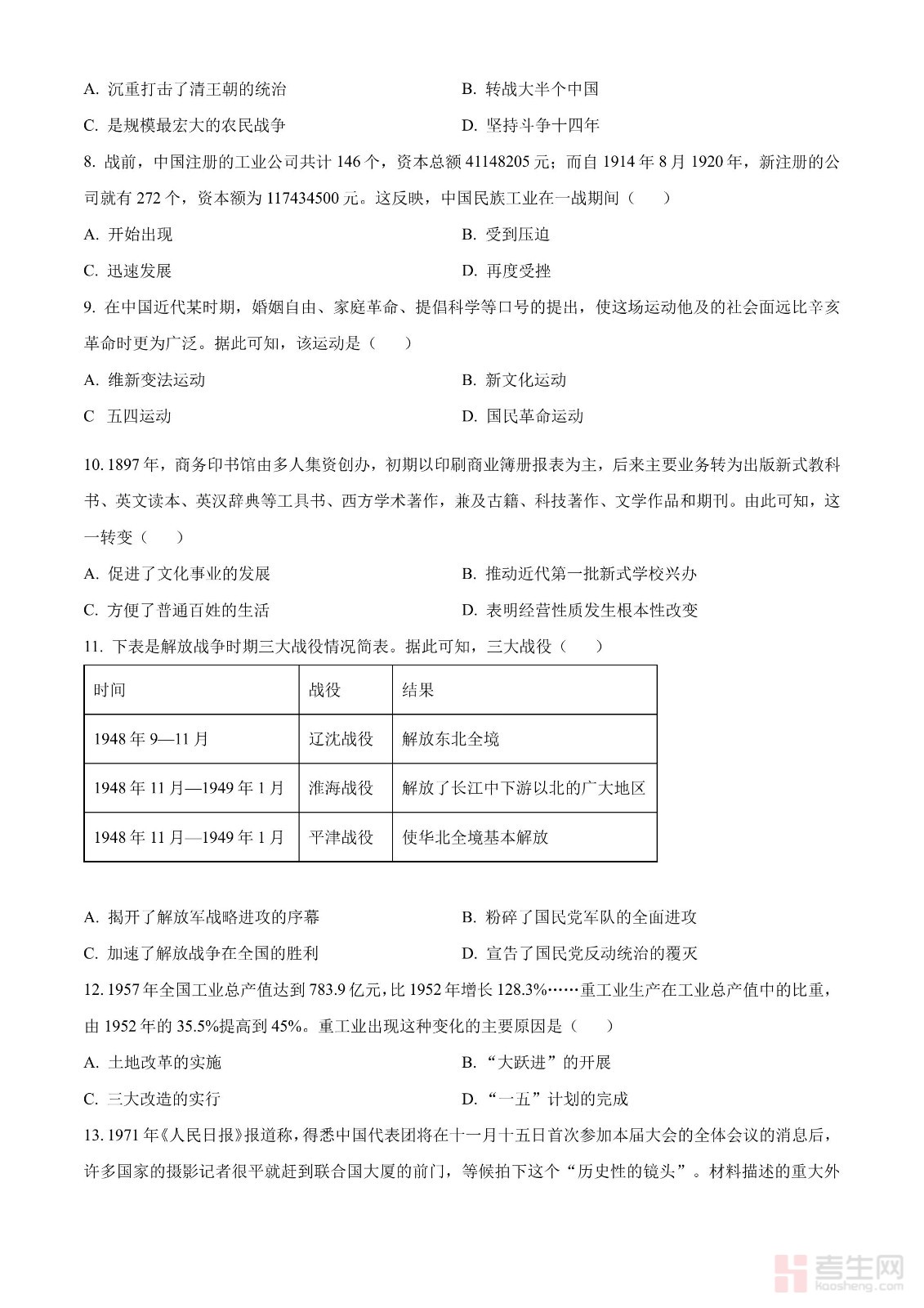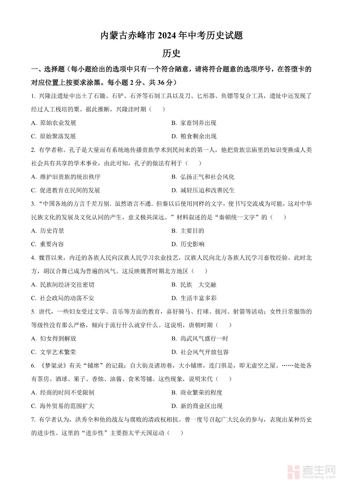 2024年内蒙古自治区赤峰市中考历史真题(原卷版)