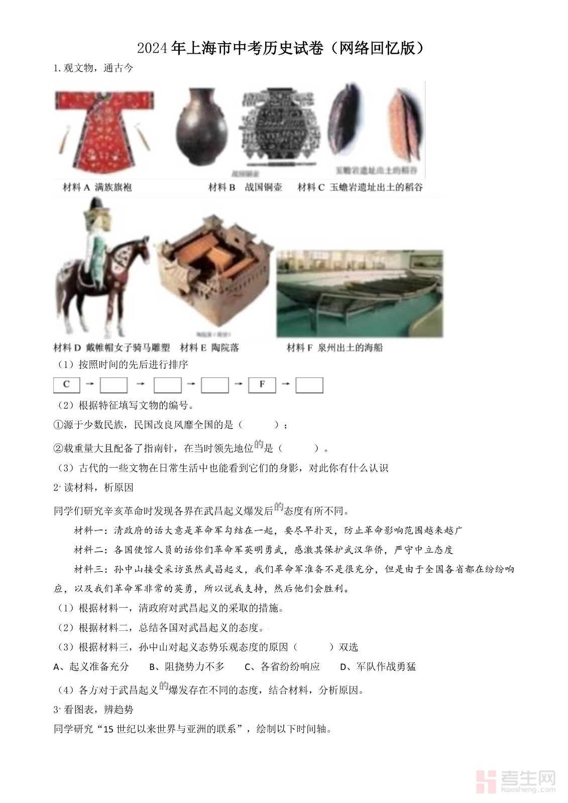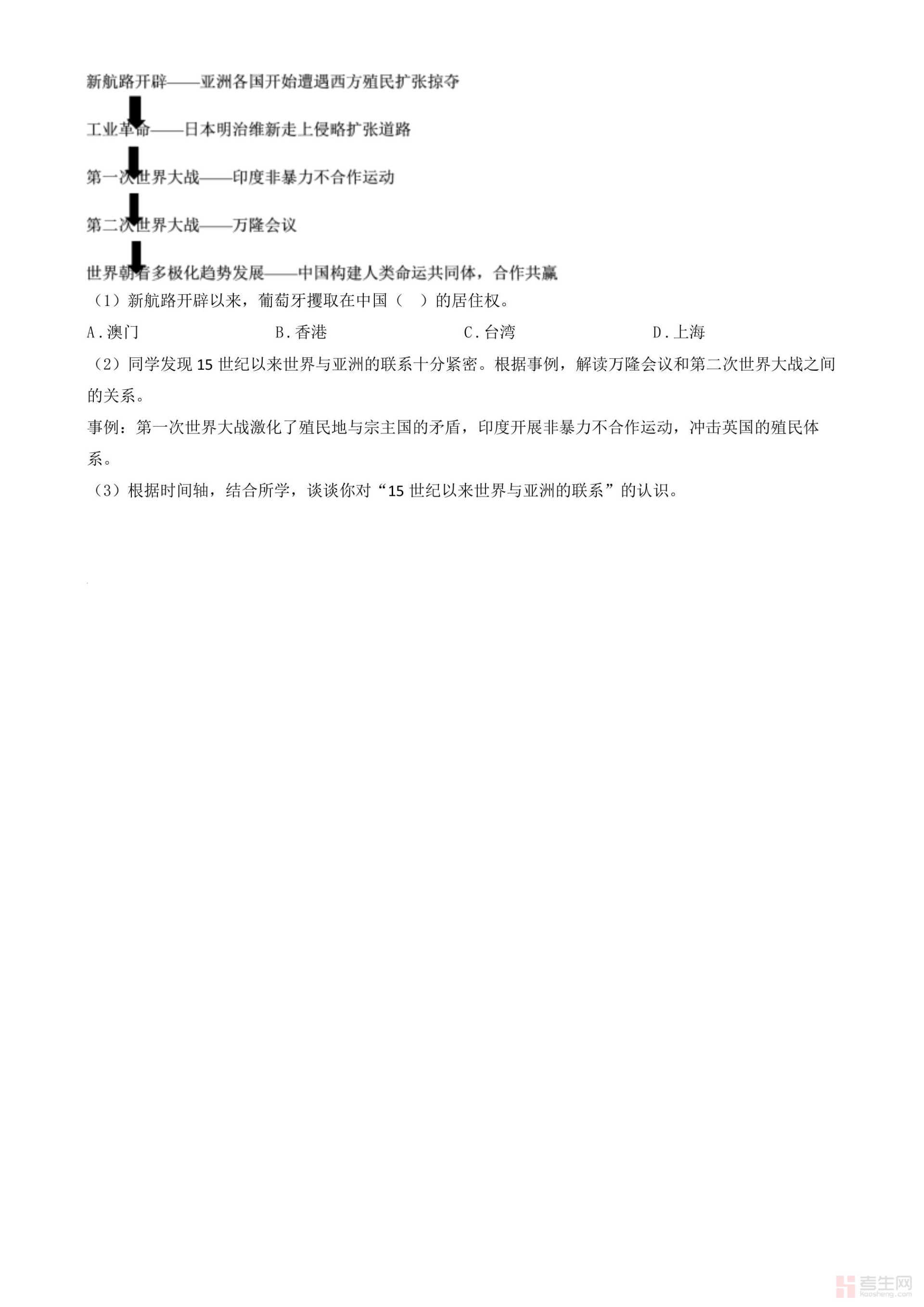 2024年上海市中考历史试题(原卷版)