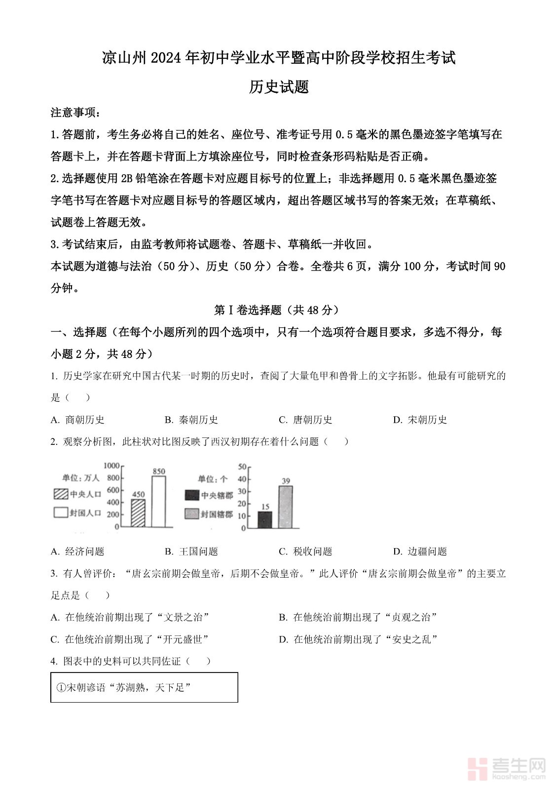 2024年四川省凉山州中考历史真题(原卷版)