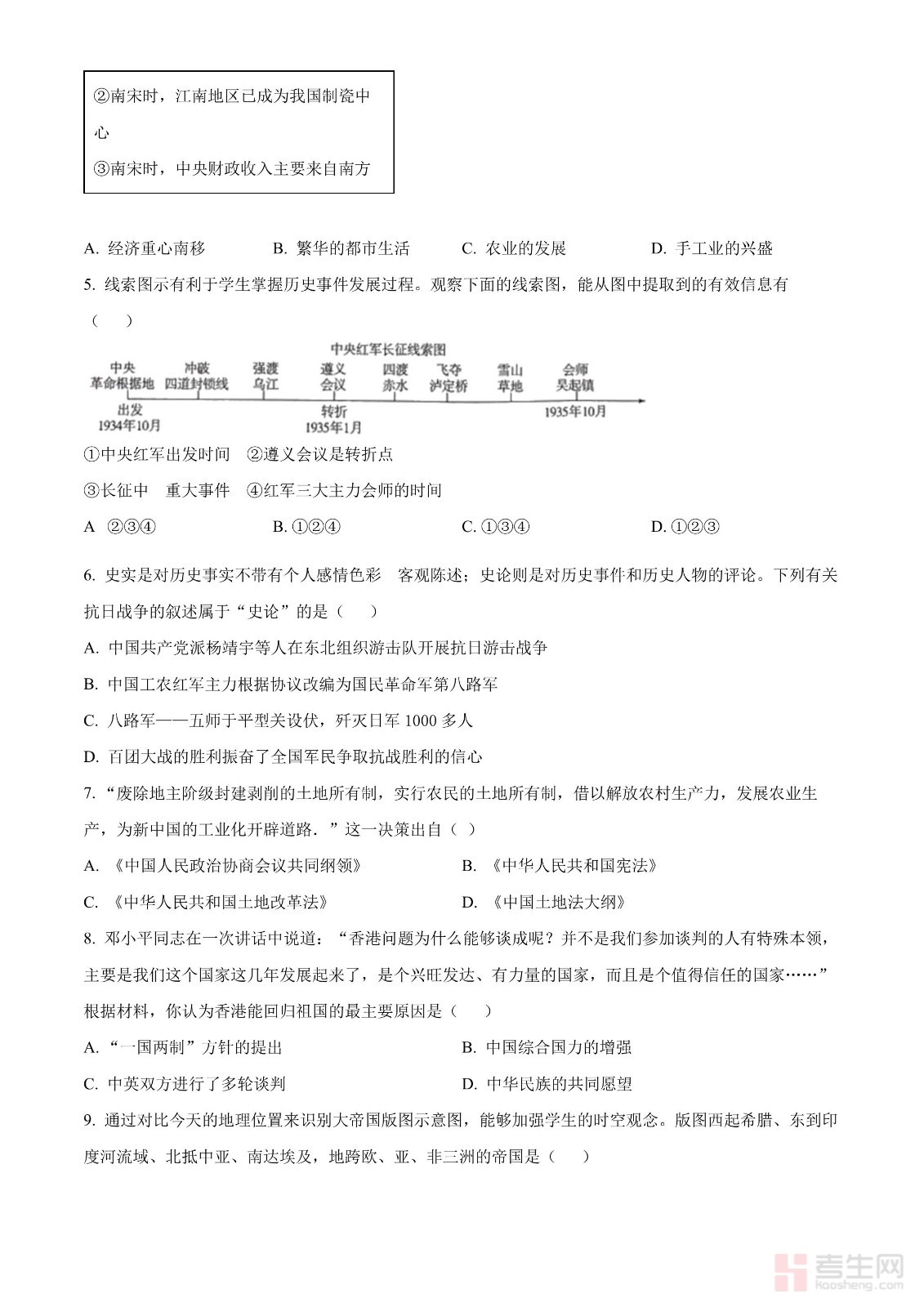 2024年广东省中考历史真题(原卷版)