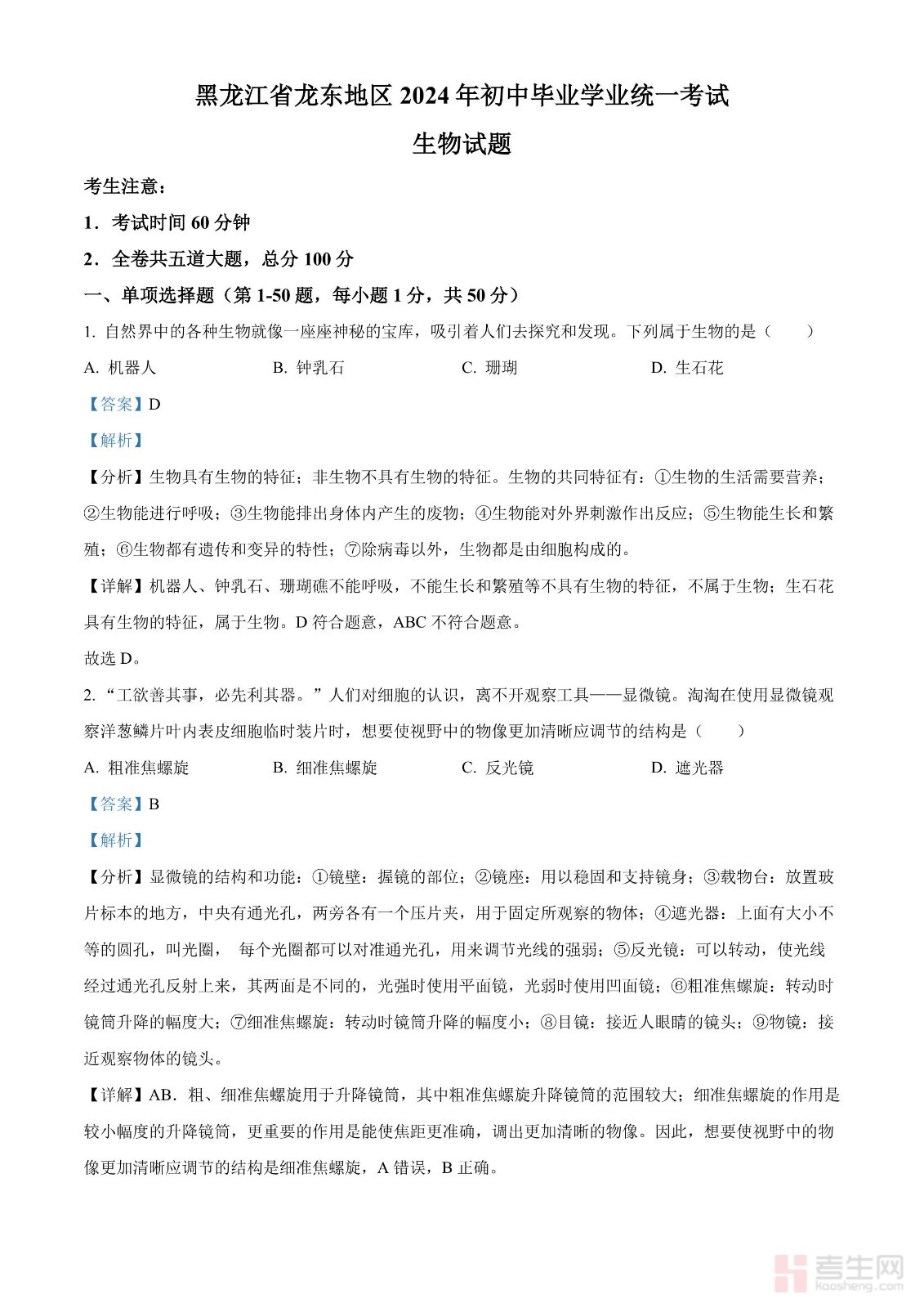 2024年中考生物真题