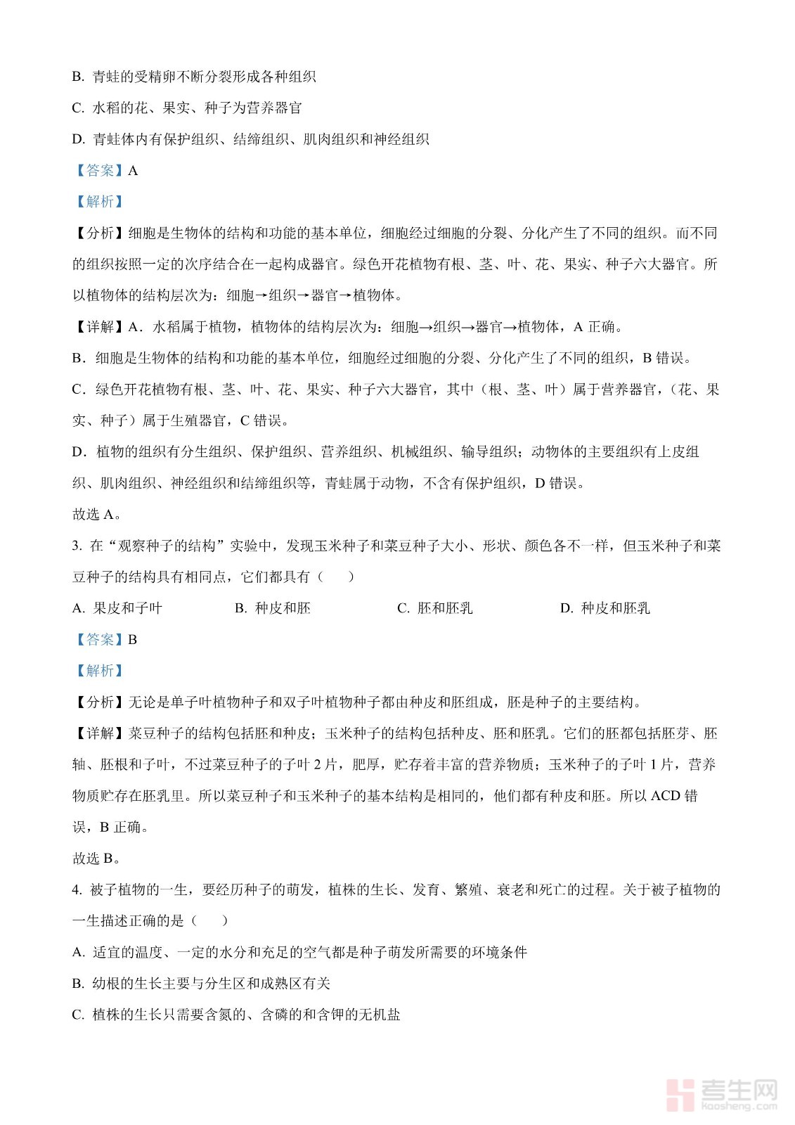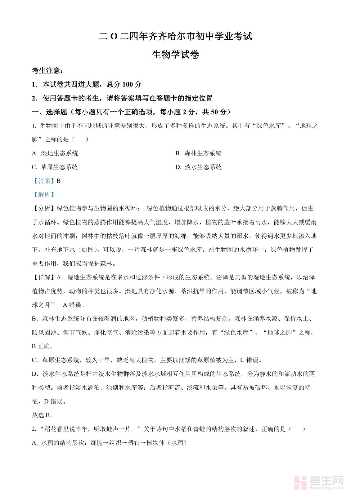 2024年黑龙江省齐齐哈尔市中考生物真题(解析版)