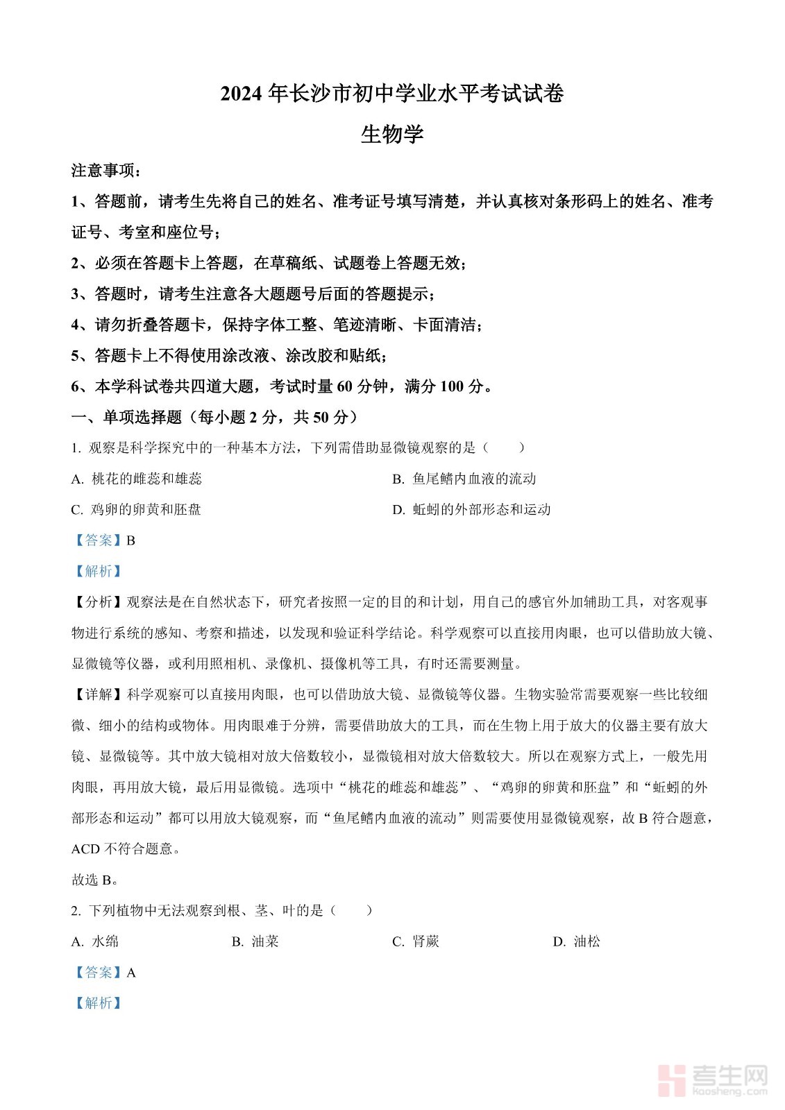2024年湖南省长沙市初中学业水平模拟考试生物试题(解析版)