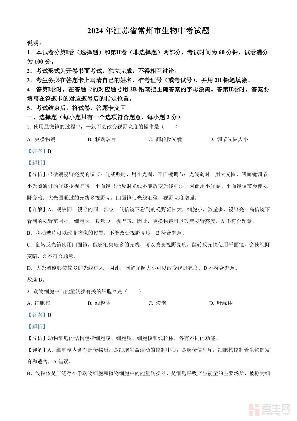 2024年江苏省常州市生物中考真题(解析版)