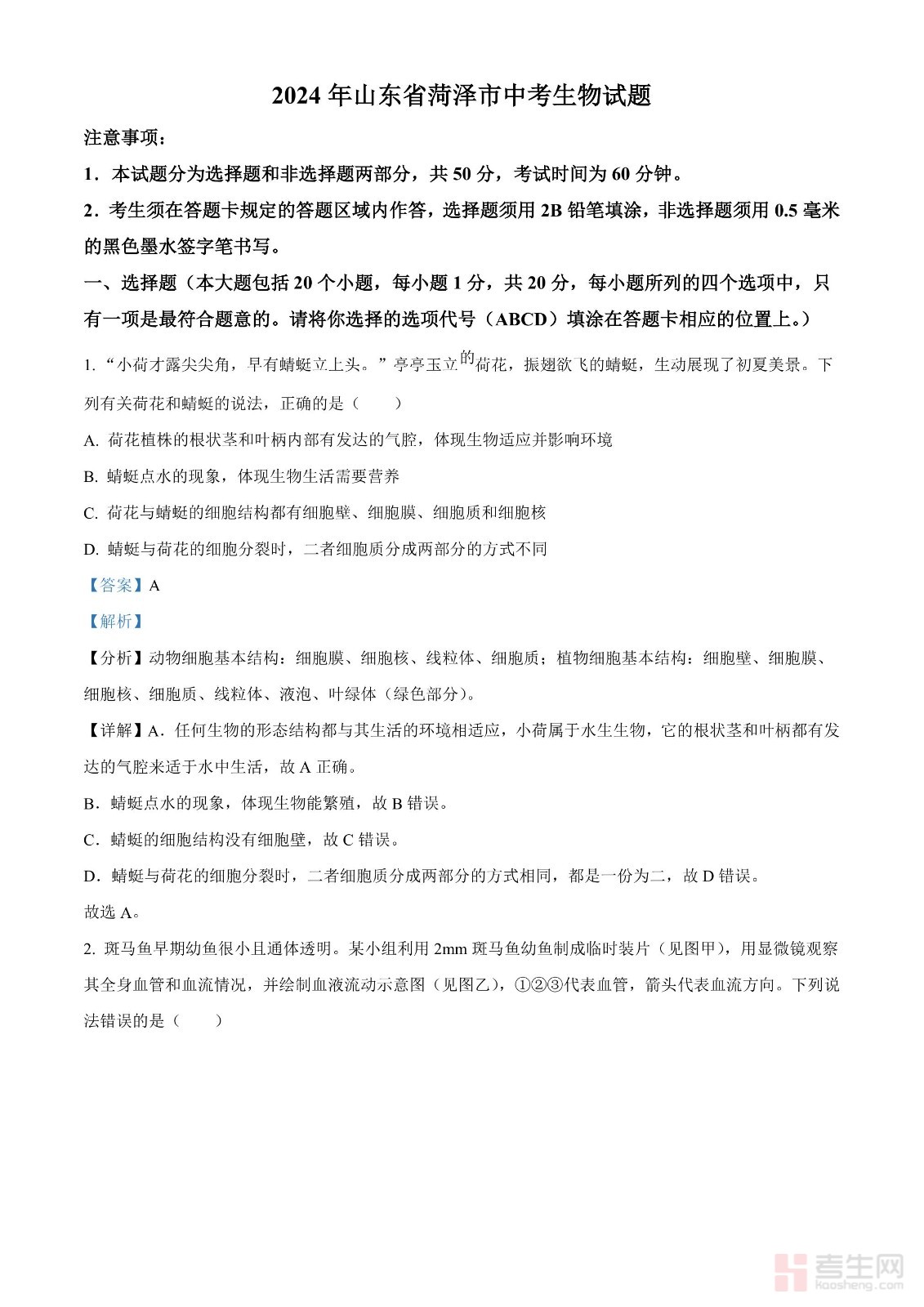 2024年山东省菏泽市中考生物真题(解析版)