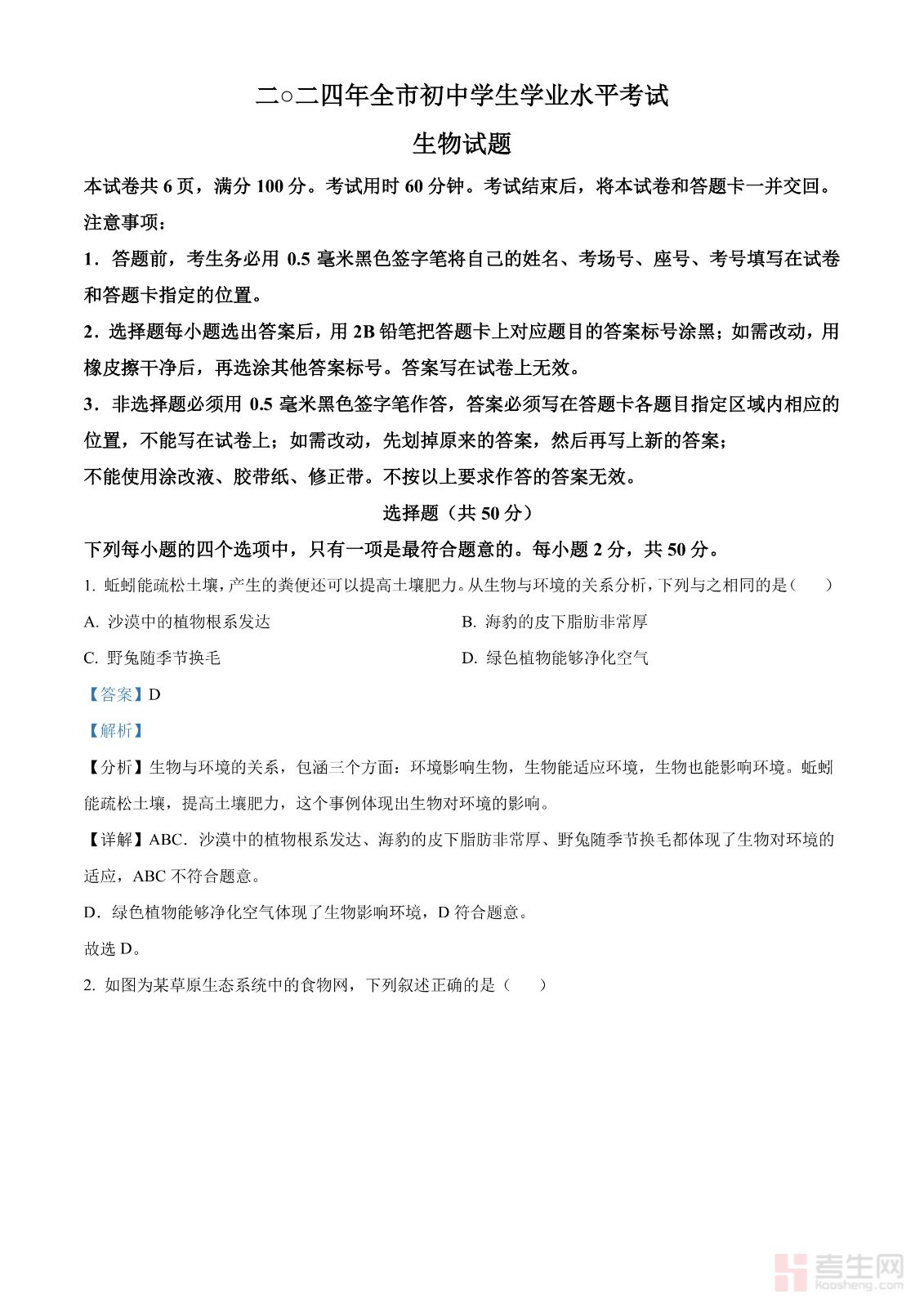 2024年中考生物真题