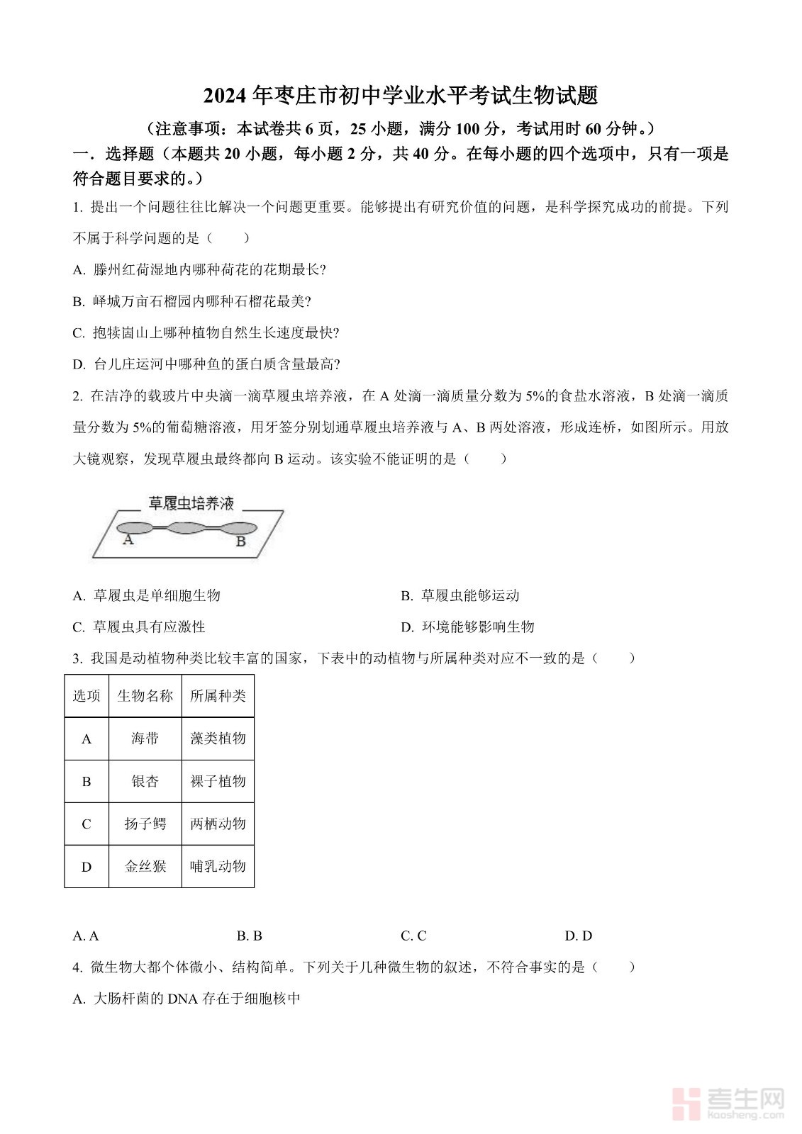 2024年山东省枣庄市中考生物真题(原卷版)