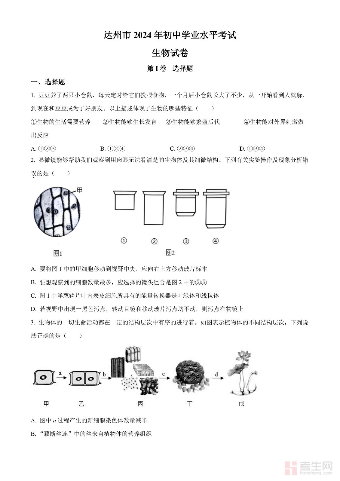 2024年四川省达州市中考生物真题(原卷版)