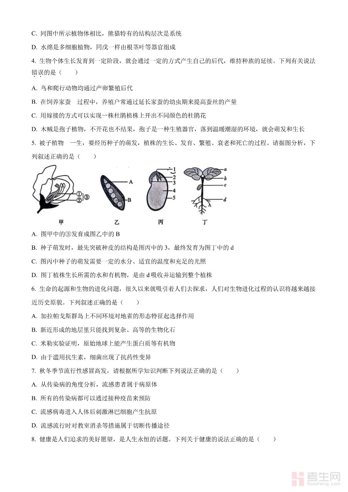 2024年四川省成都市中考生物试题(原卷版)