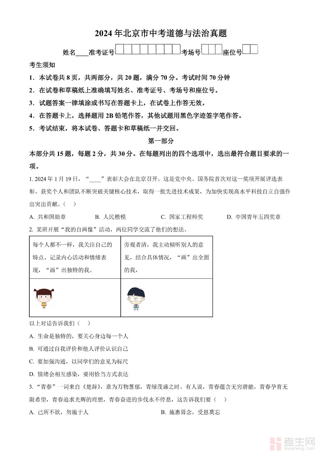 2024年重庆市中考道德与法治真题(B卷)(原卷版)