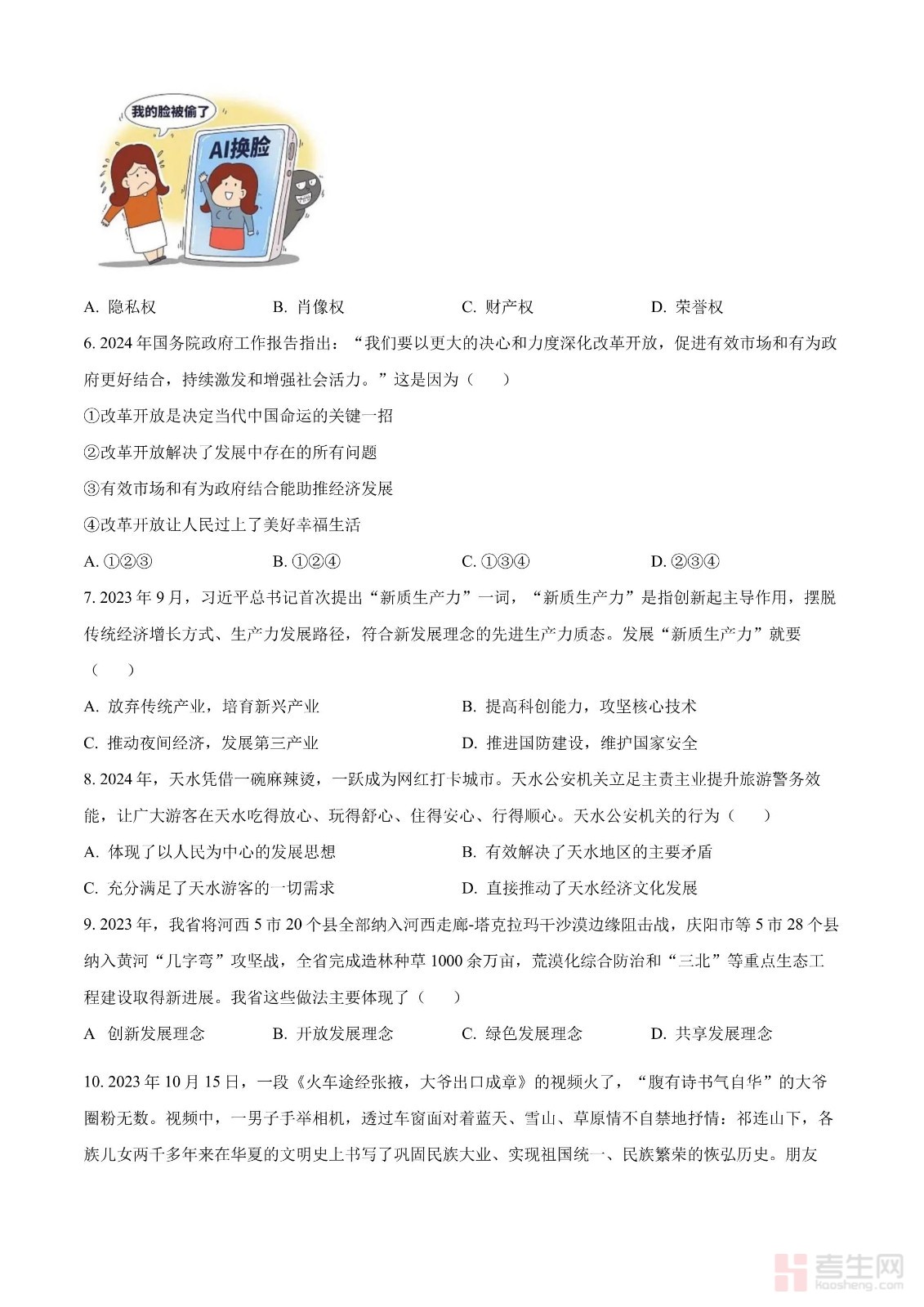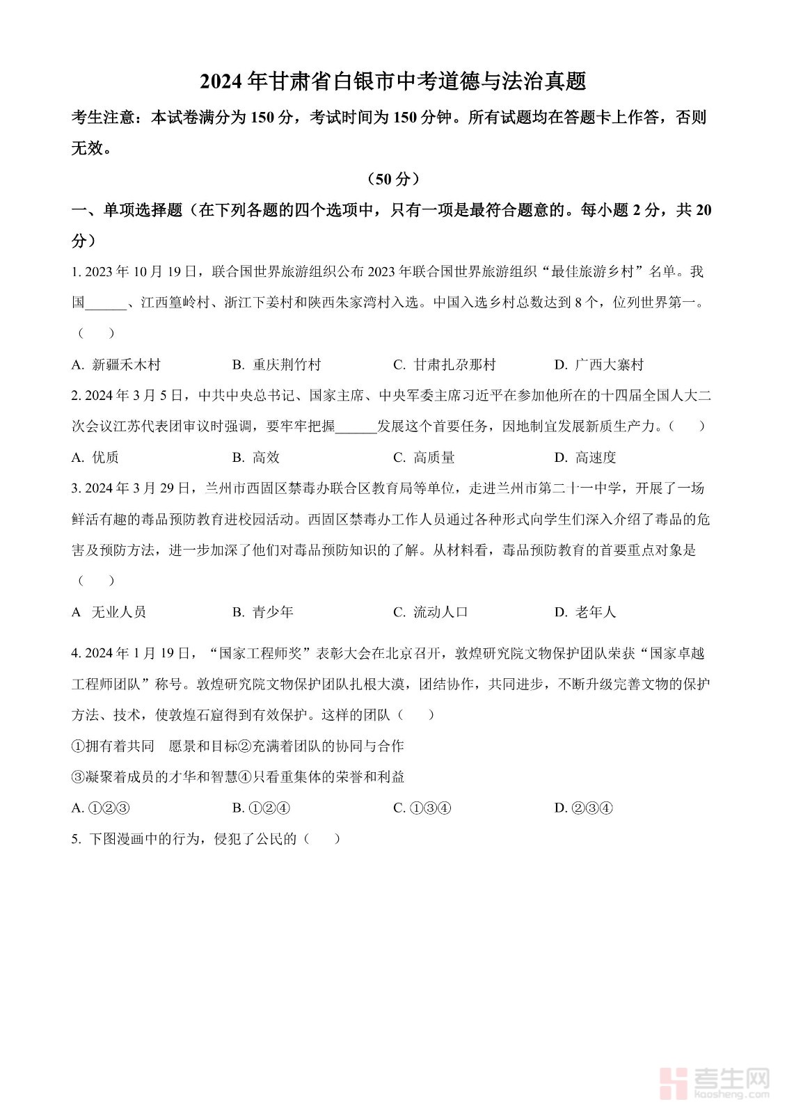 2024年甘肃省白银市中考道德与法治真题(原卷版)