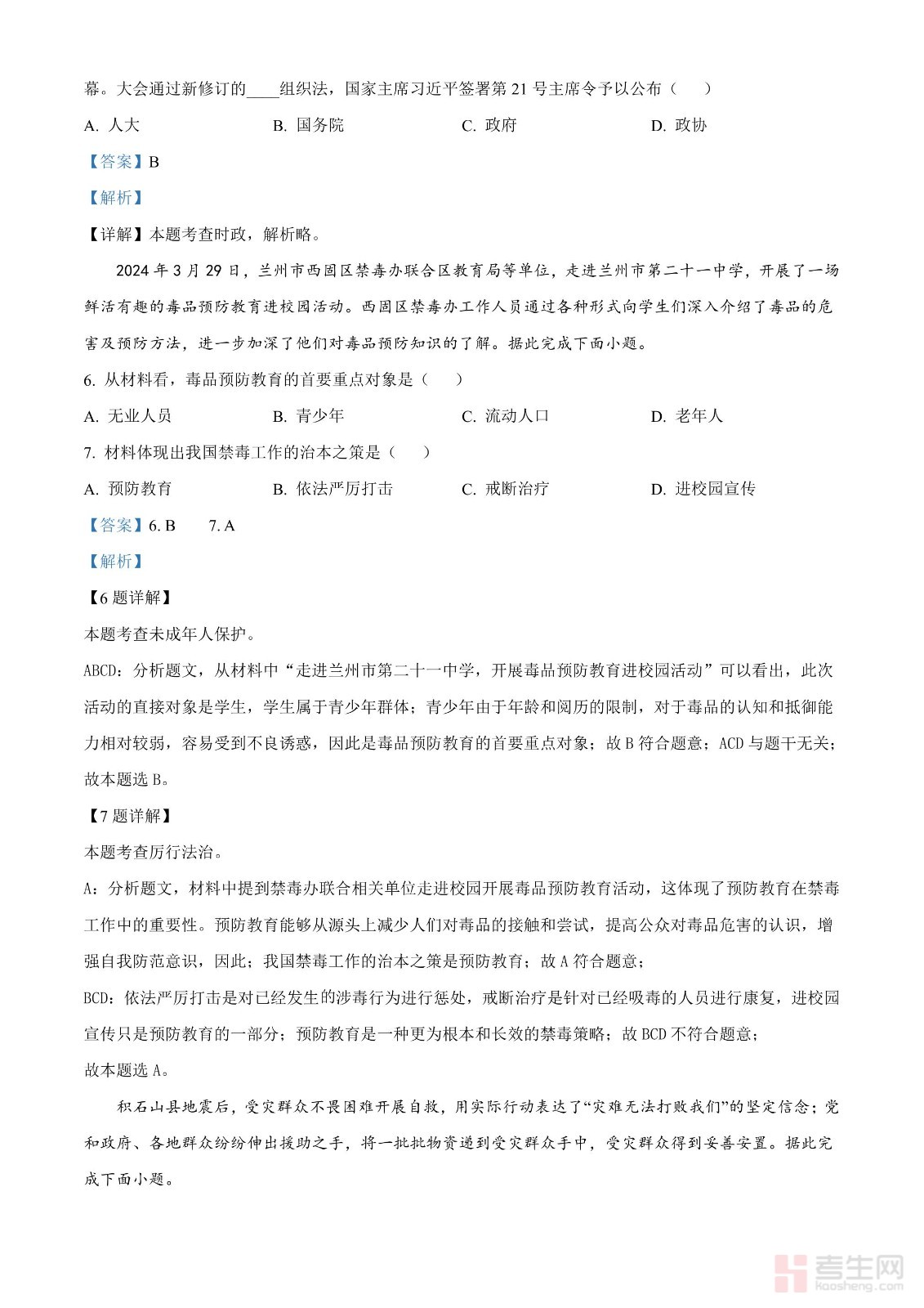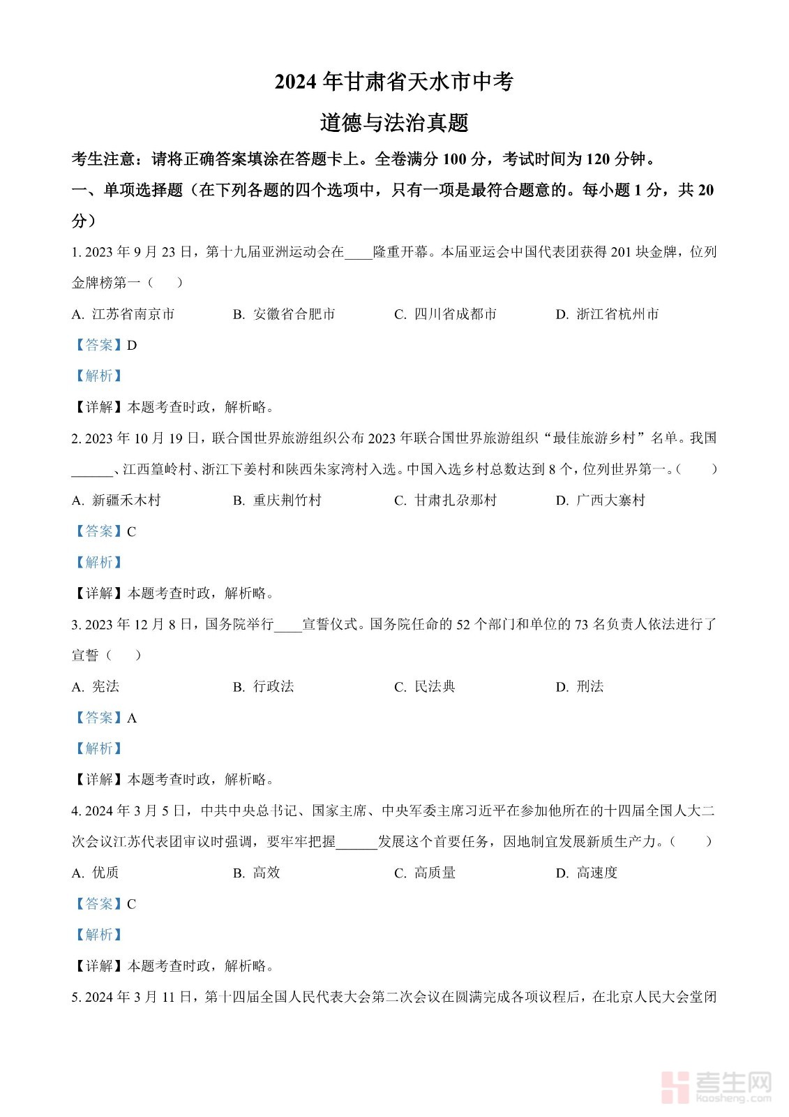 2024年甘肃省天水市中考道德与法治真题(解析版)