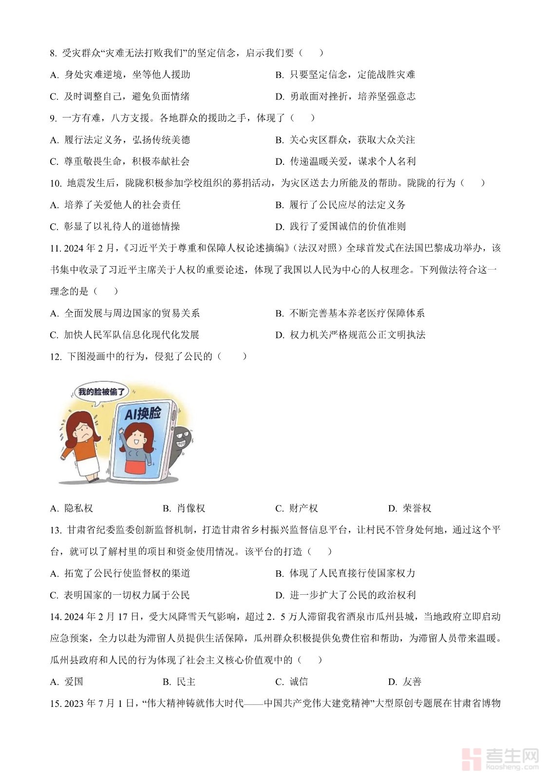 2024年甘肃省天水市中考道德与法治真题(原卷版)