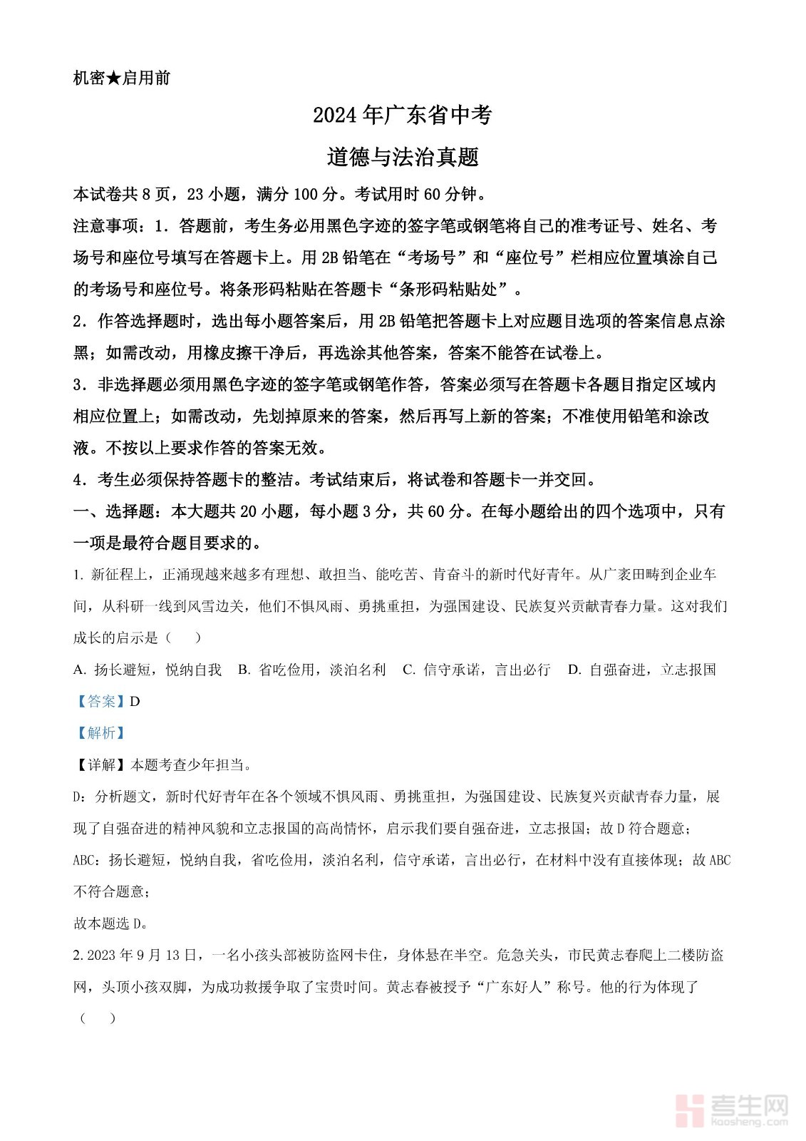 2024年广东省中考道德与法治真题(解析版)