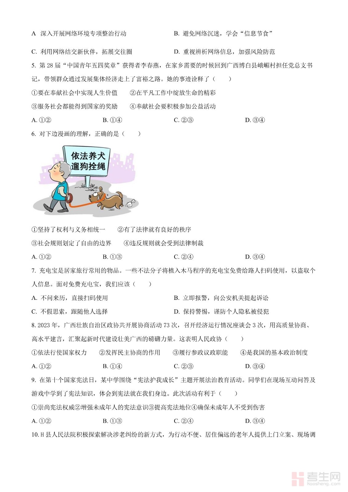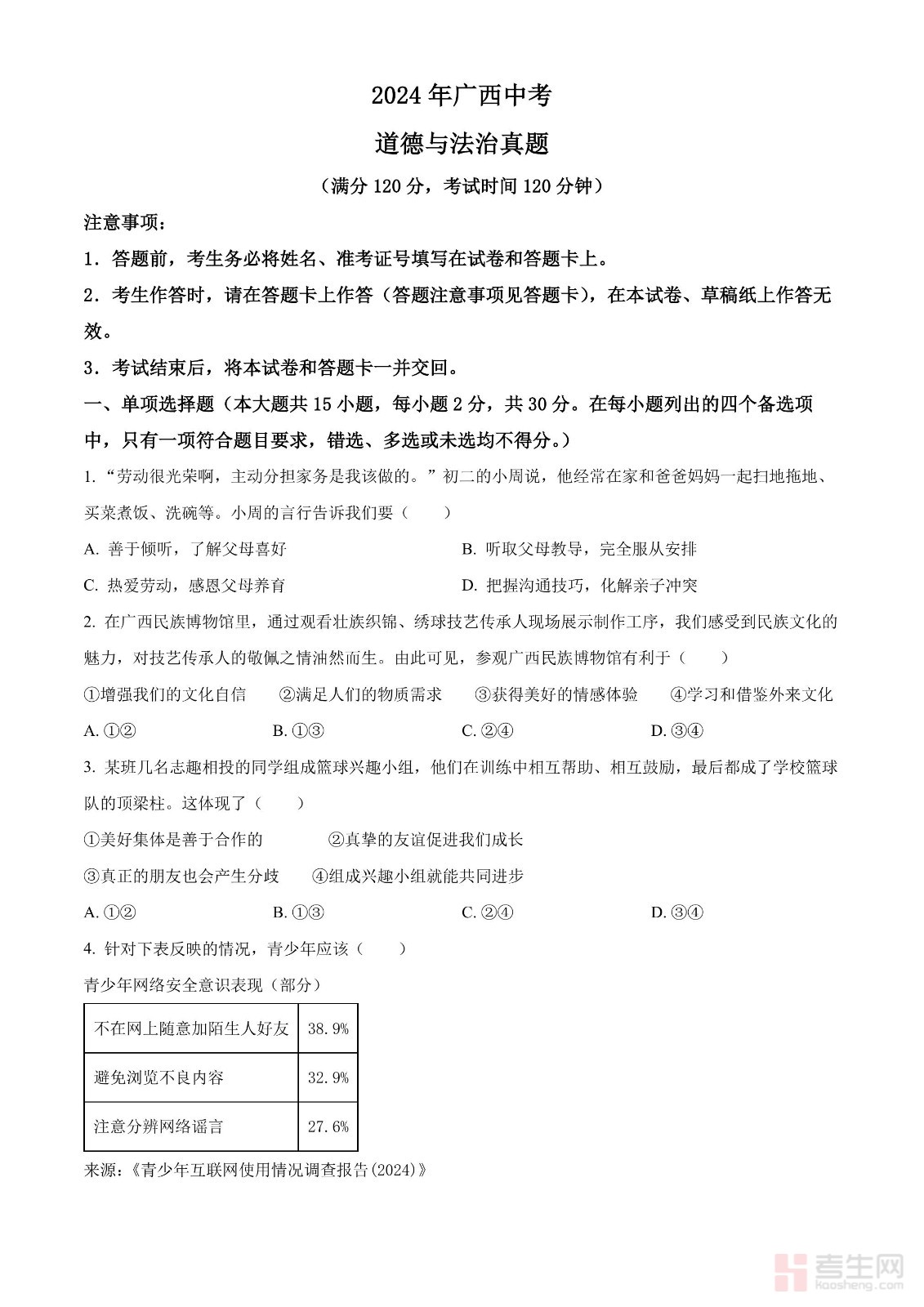 2024年广西中考道德与法治真题(原卷版)
