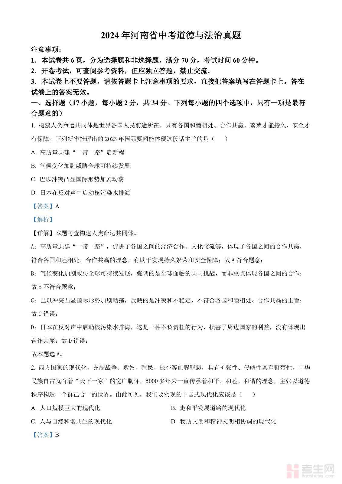2024年河南省中考道德与法治真题(解析版)