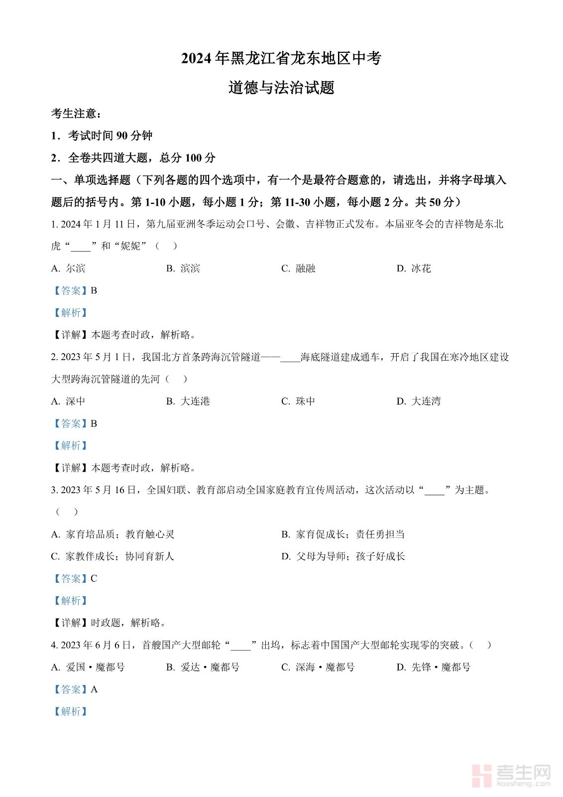 2024年黑龙江省龙东地区中考道德与法治试题(解析版)