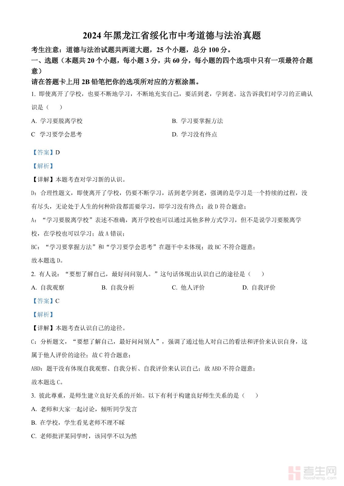 2024年黑龙江省绥化市中考道德与法治真题(解析版)