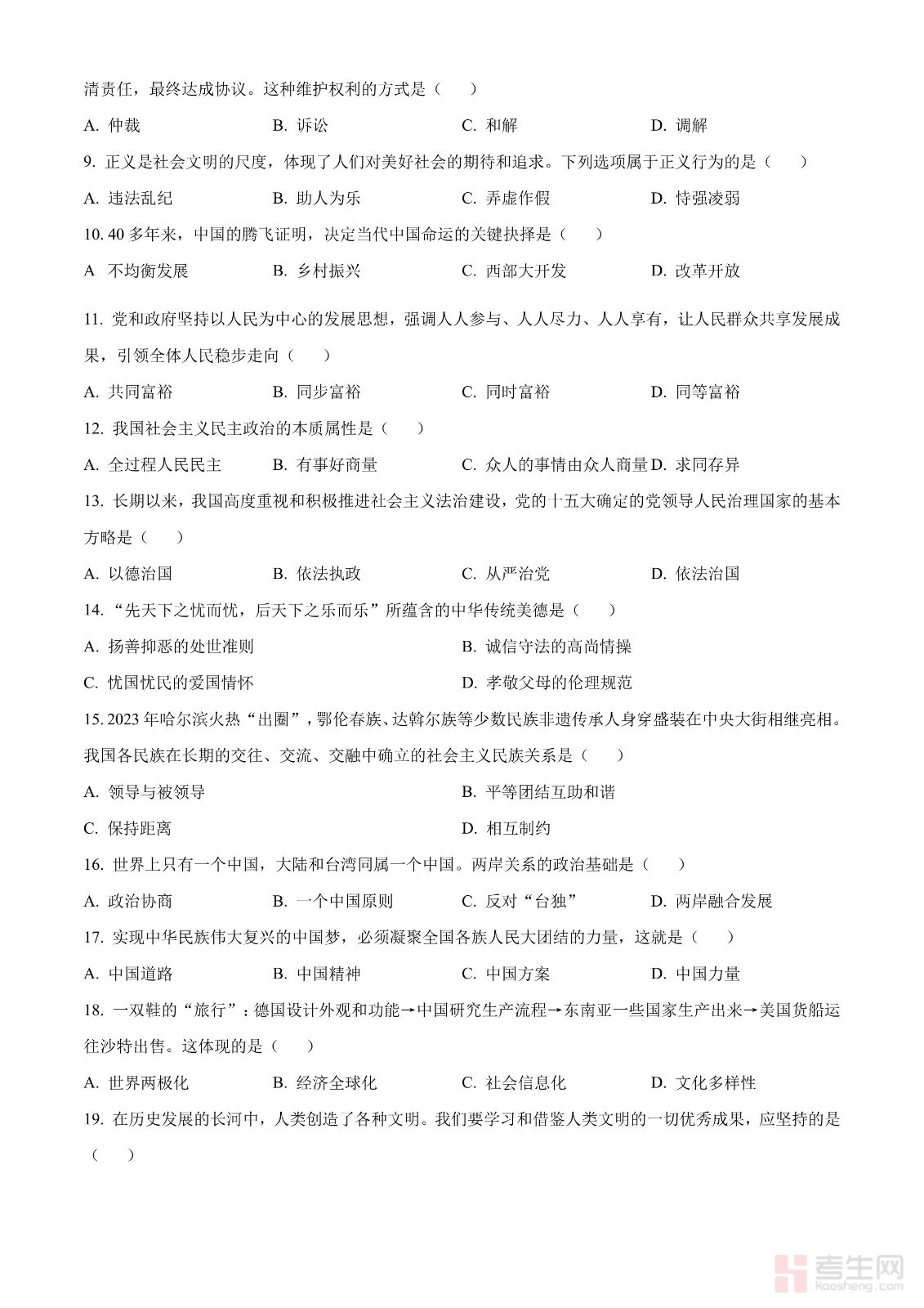 2024年中考道德与法治真题
