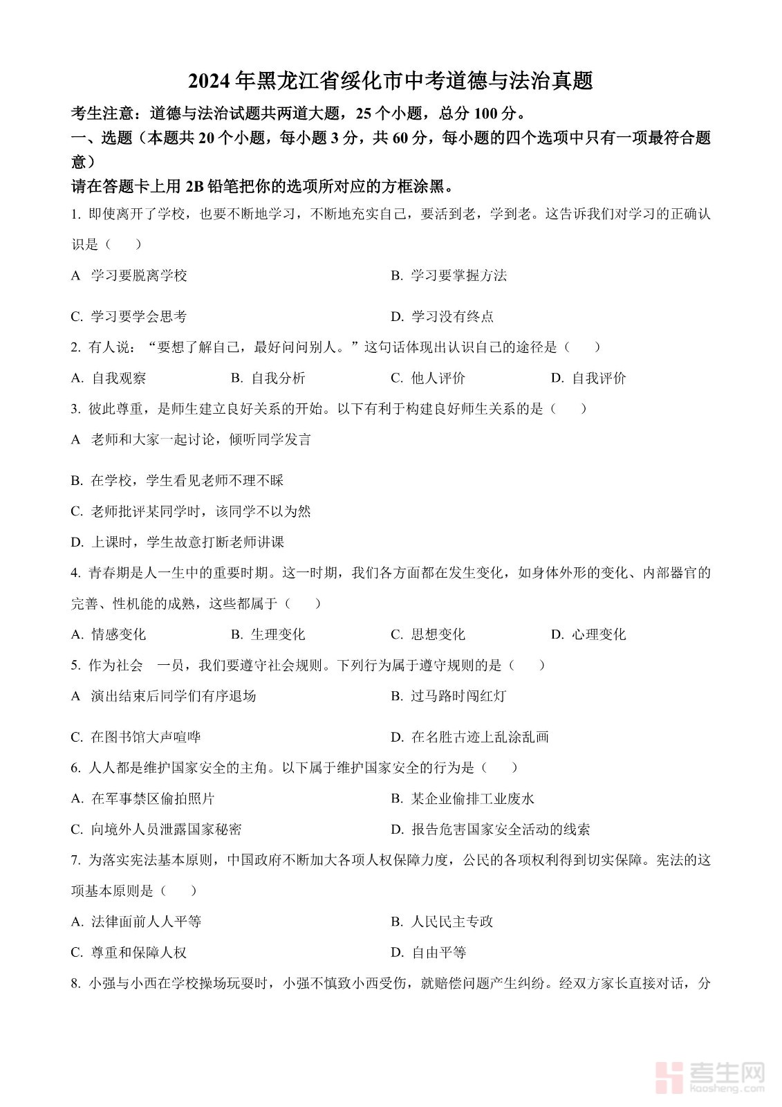 2024年黑龙江省绥化市中考道德与法治真题(原卷版)