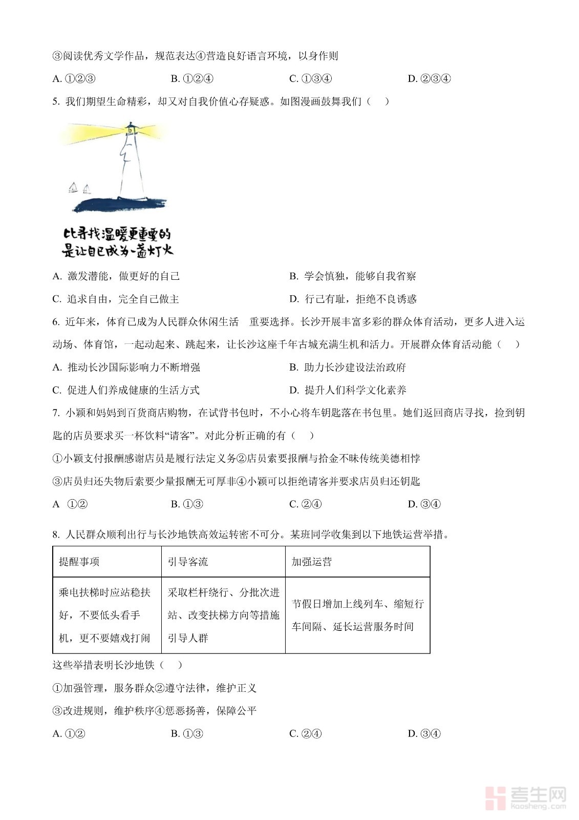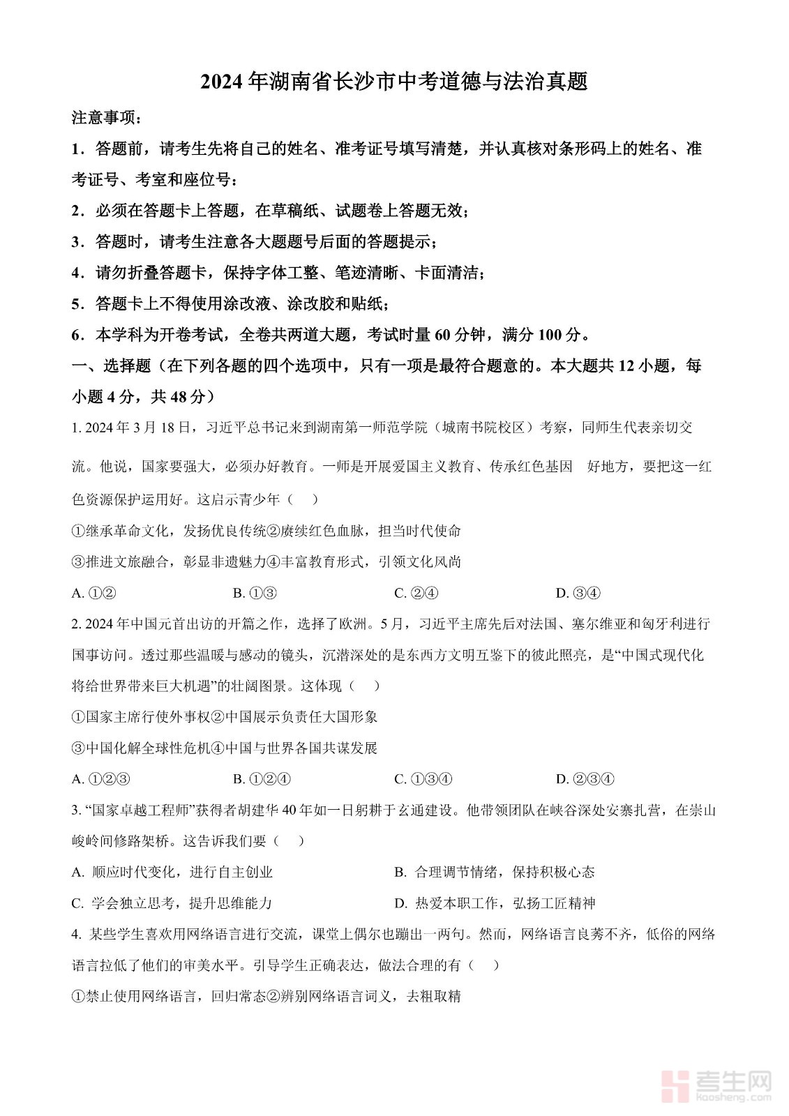 2024年湖南省长沙市中考道德与法治真题(原卷版)