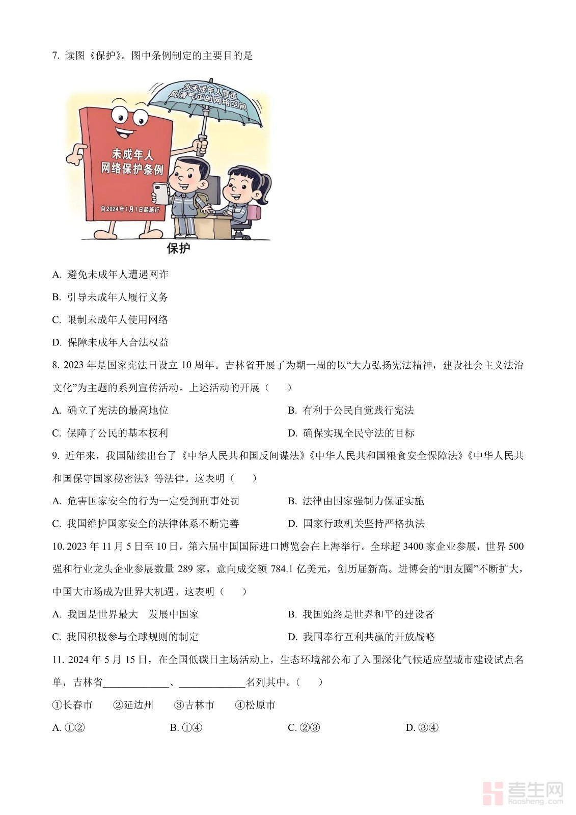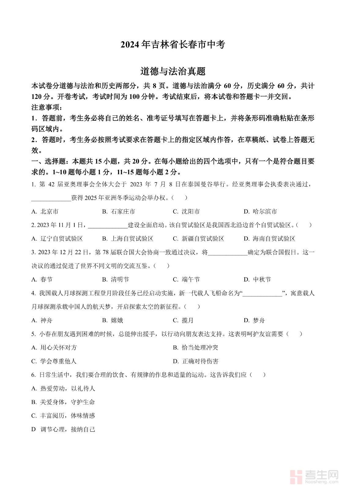 2024年吉林省长春市中考道德与法治真题(原卷版)
