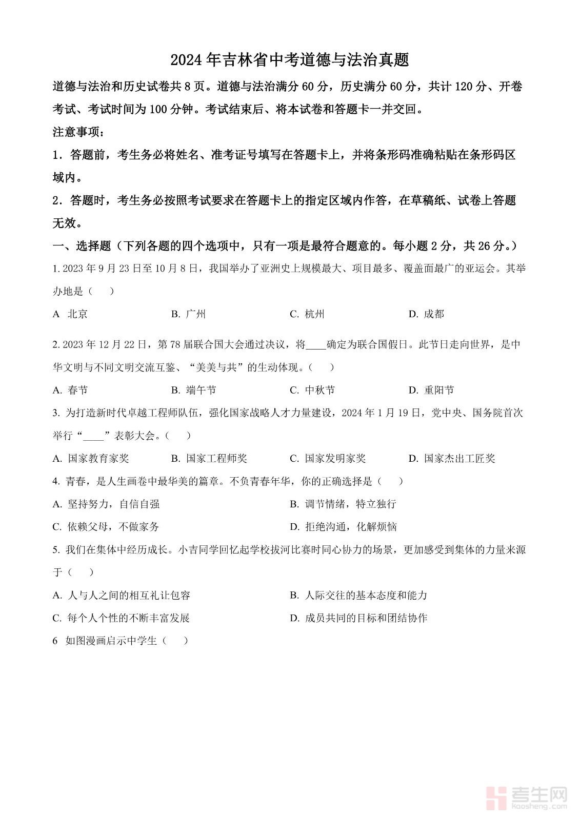 2024年重庆市中考道德与法治真题(B卷)(原卷版)