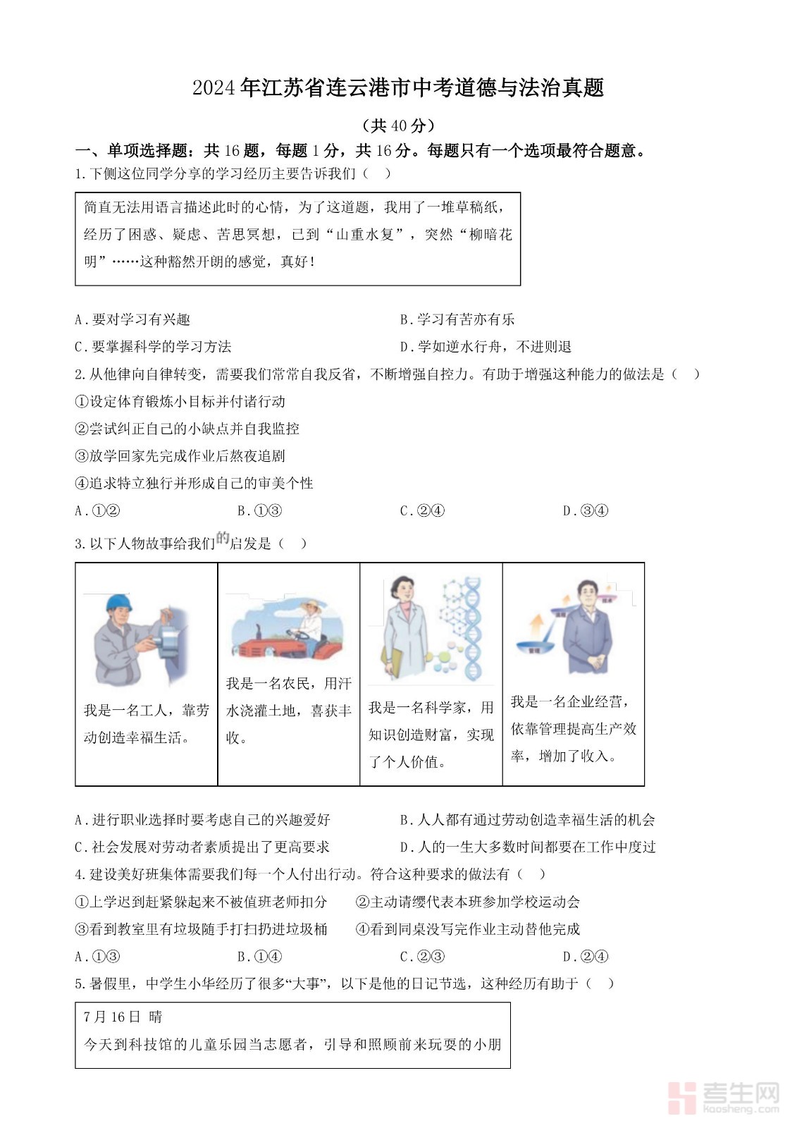 2024年江苏省连云港市中考道德与法治真题(原卷版)