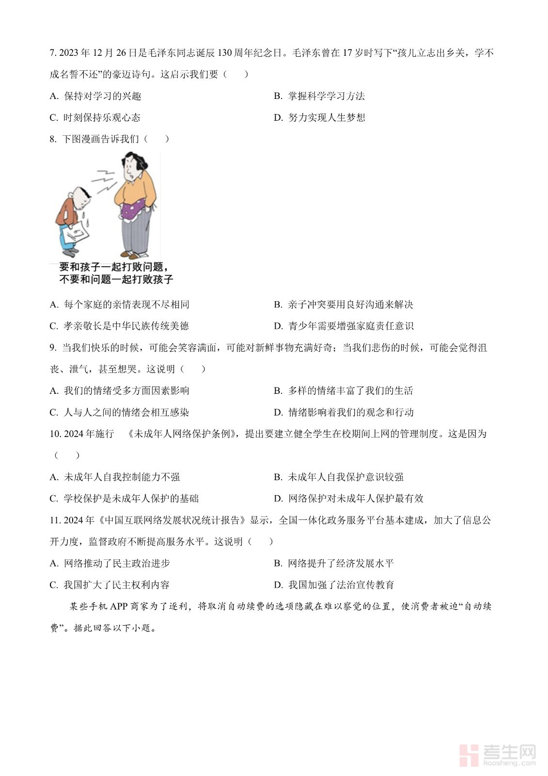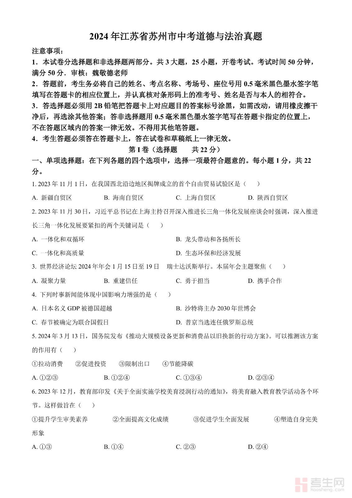 2024年江苏省苏州市中考道德与法治真题(原卷版)