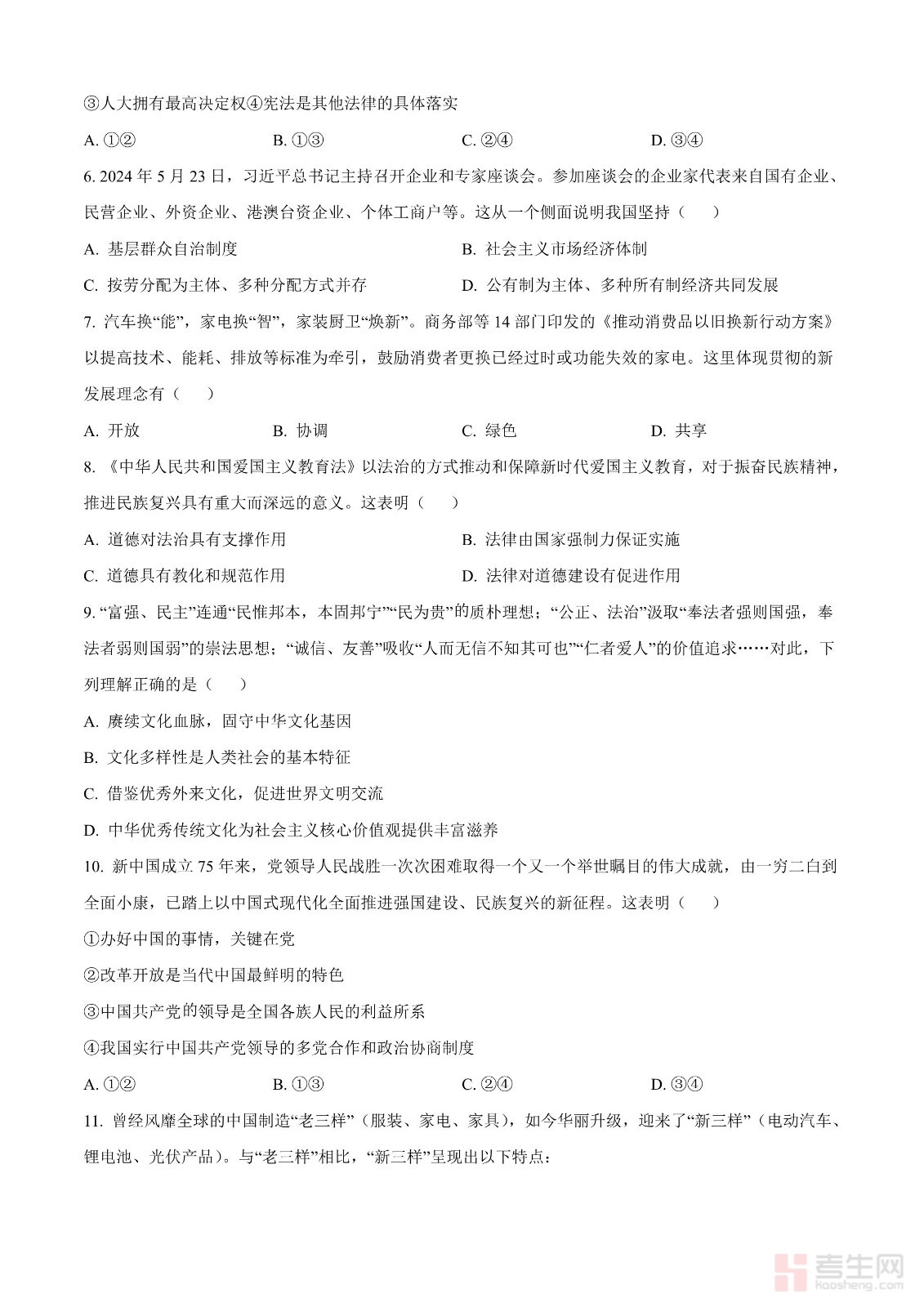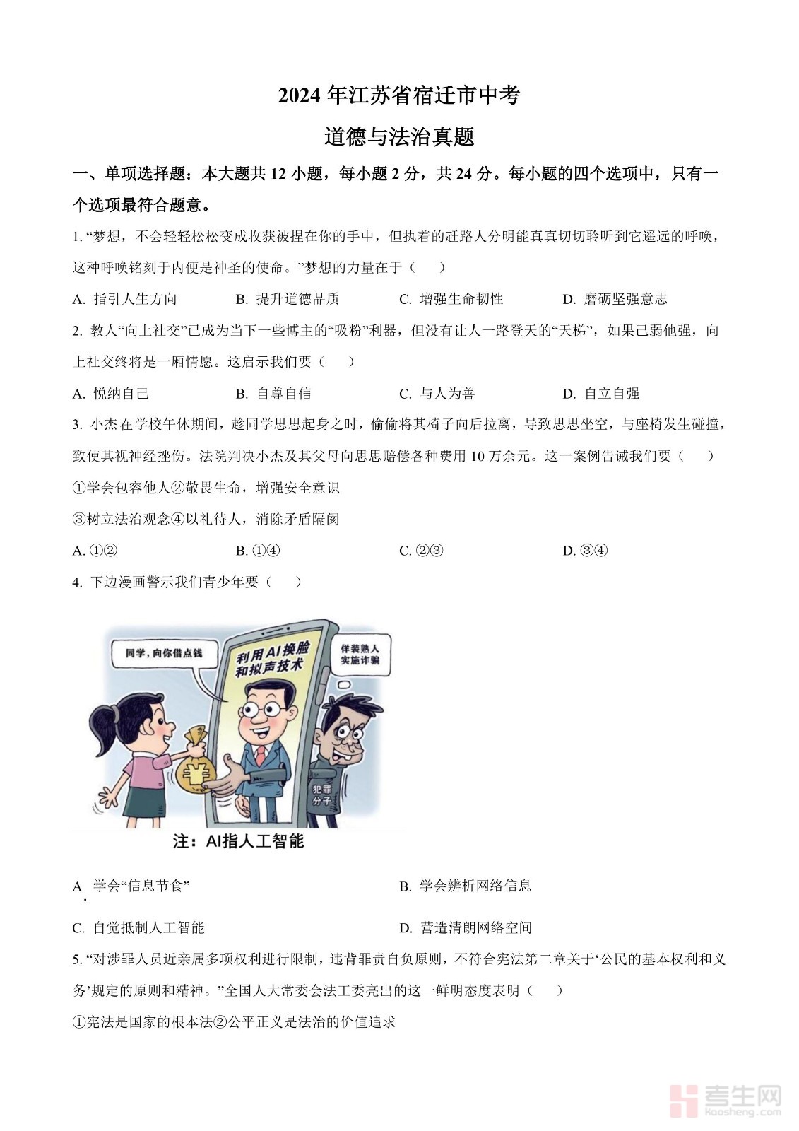 2024年江苏省宿迁市中考道德与法治真题(原卷版)