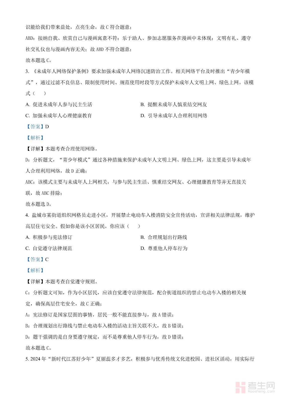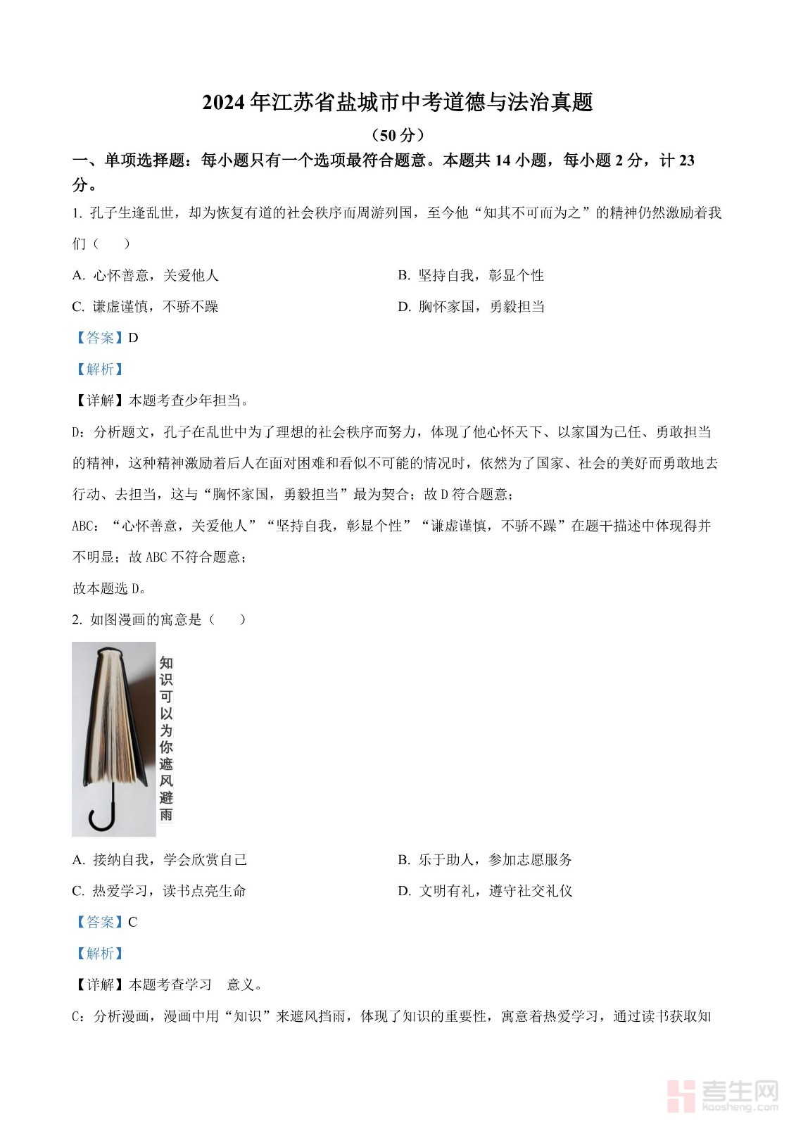 2024年江苏省盐城市中考道德与法治真题(解析版)