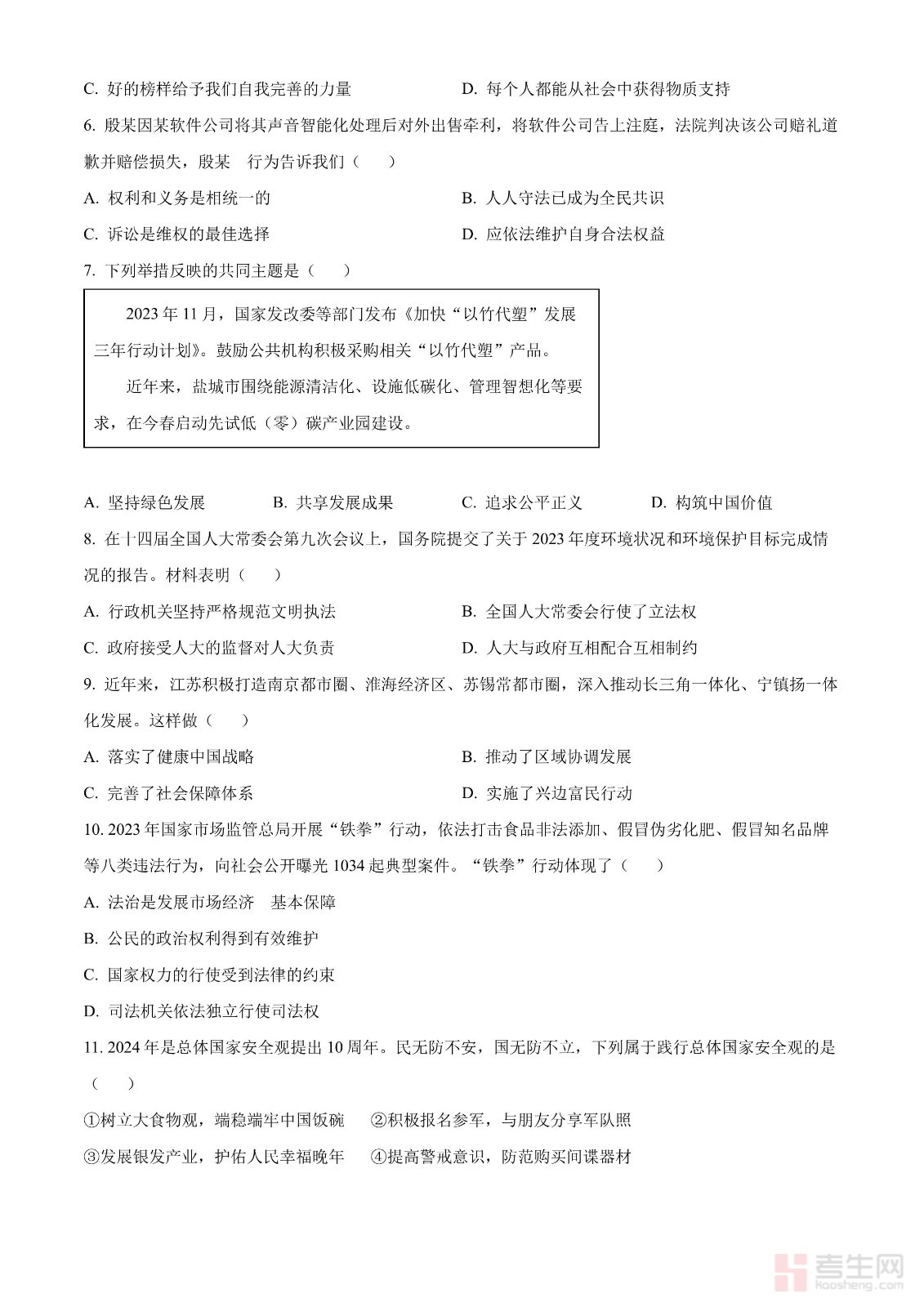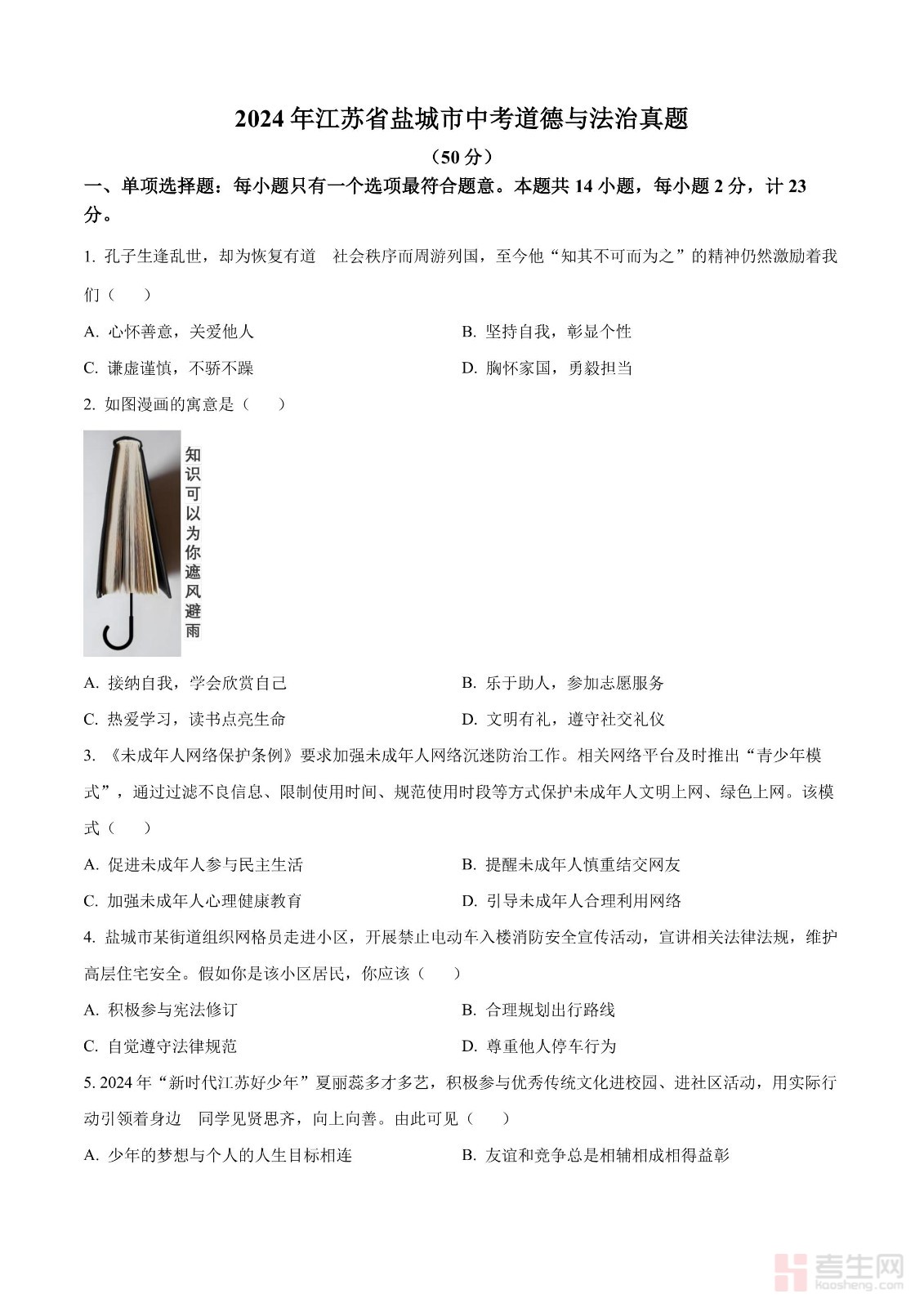 2024年江苏省盐城市中考道德与法治真题(原卷版)