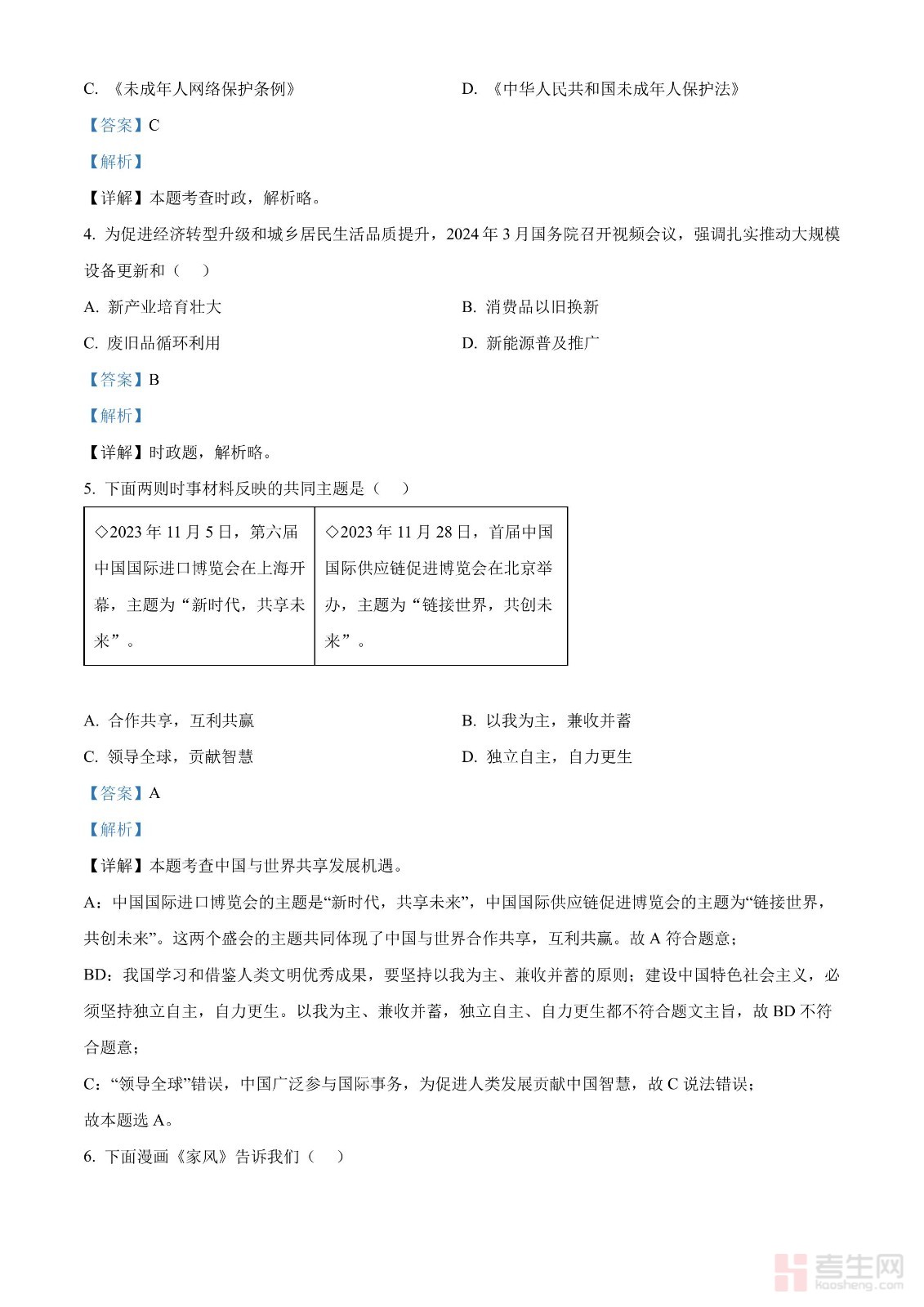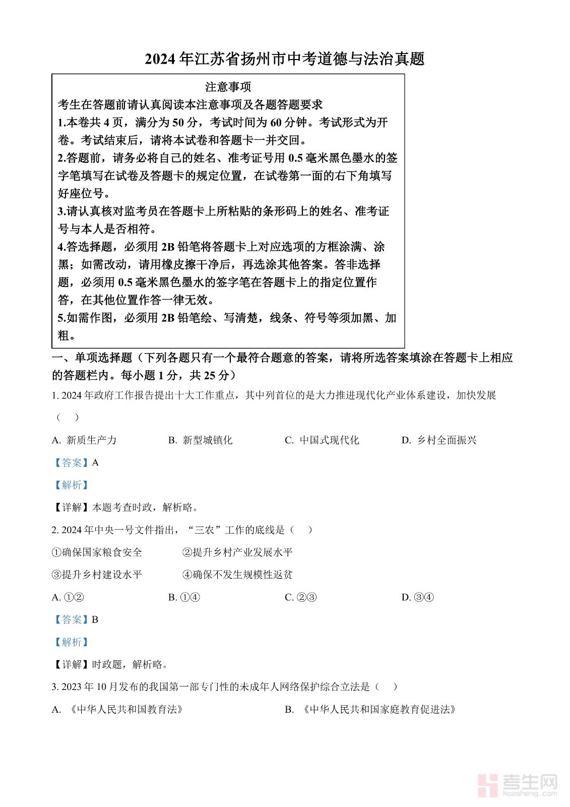 2024年江苏省扬州市中考道德与法治真题(解析版)