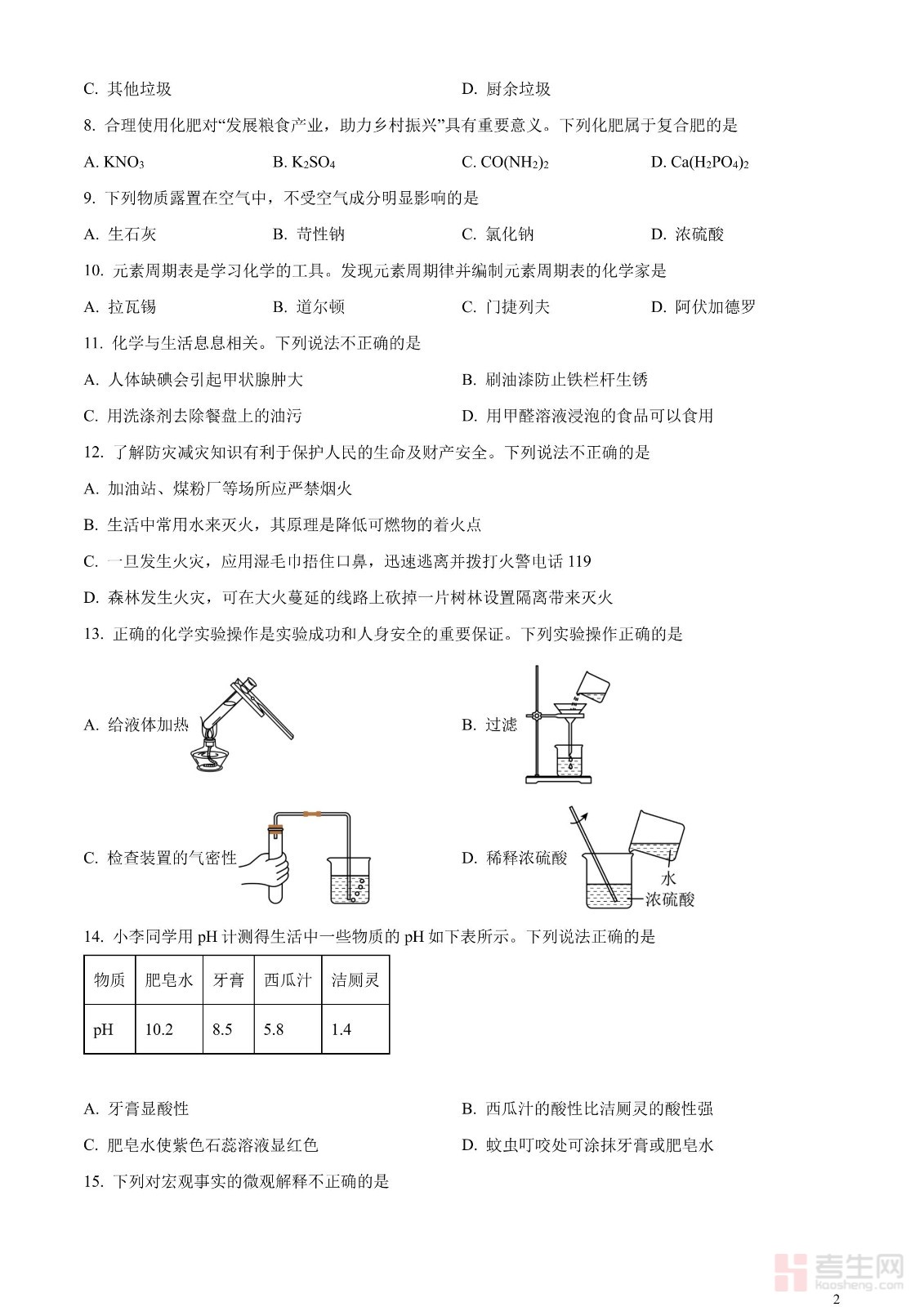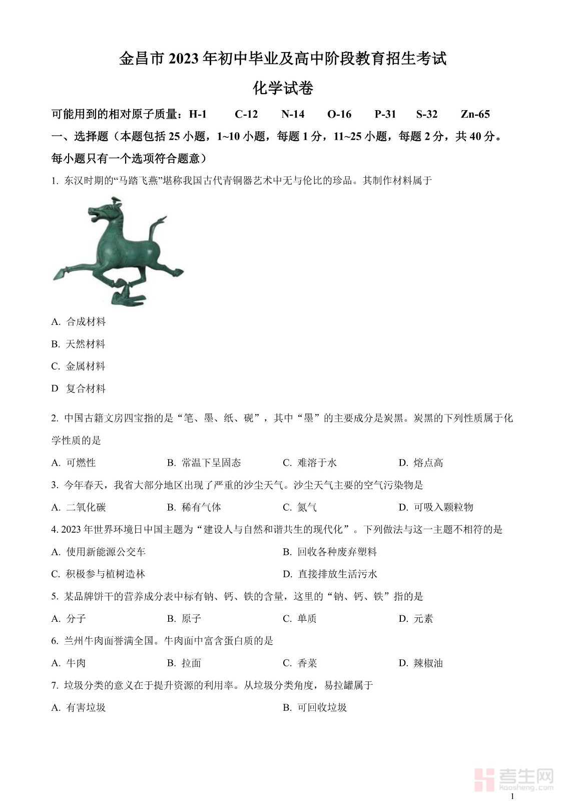 2023年甘肃省金昌市中考化学真题(原卷版)