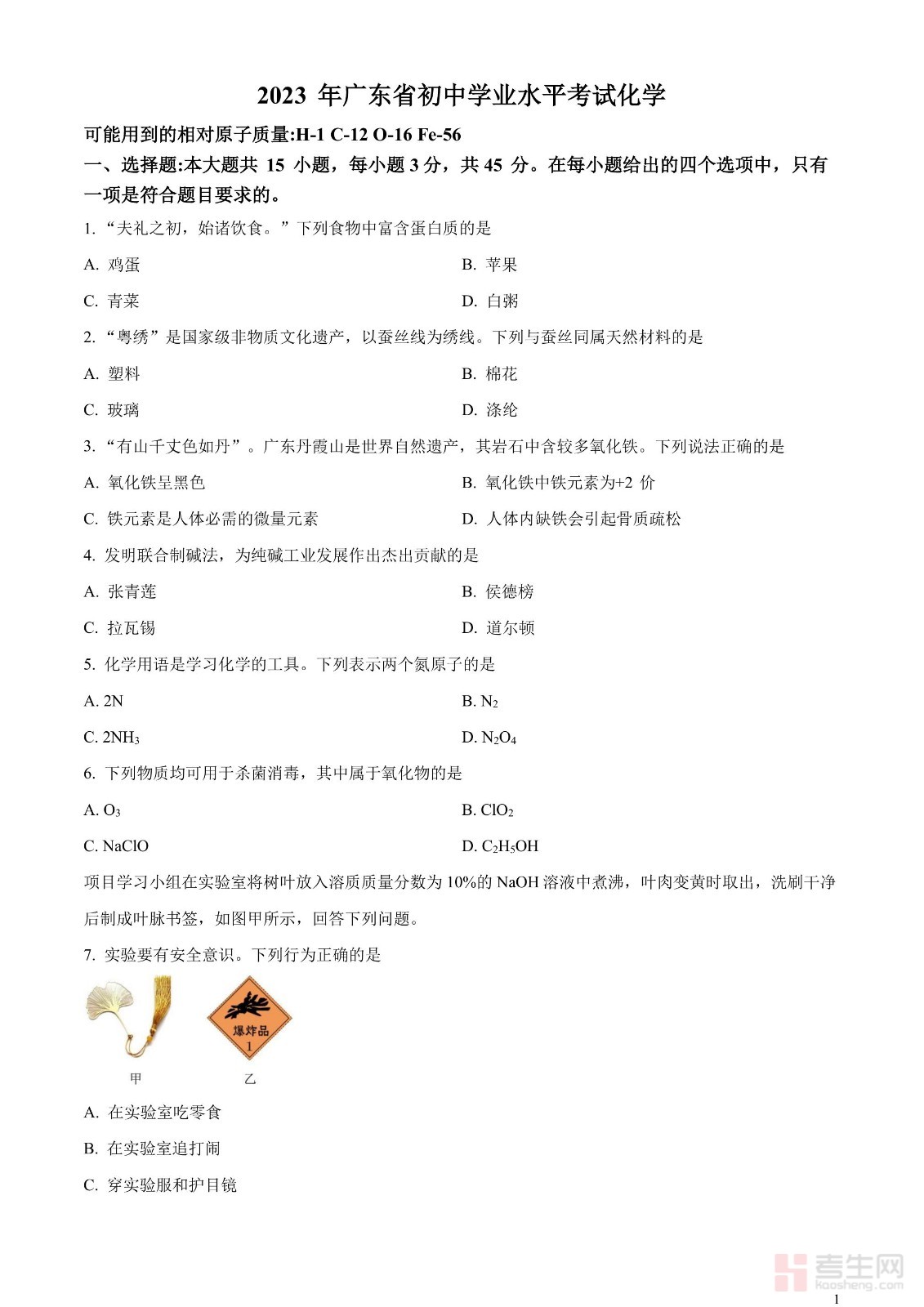 2023年广东省中考化学真题(原卷版)