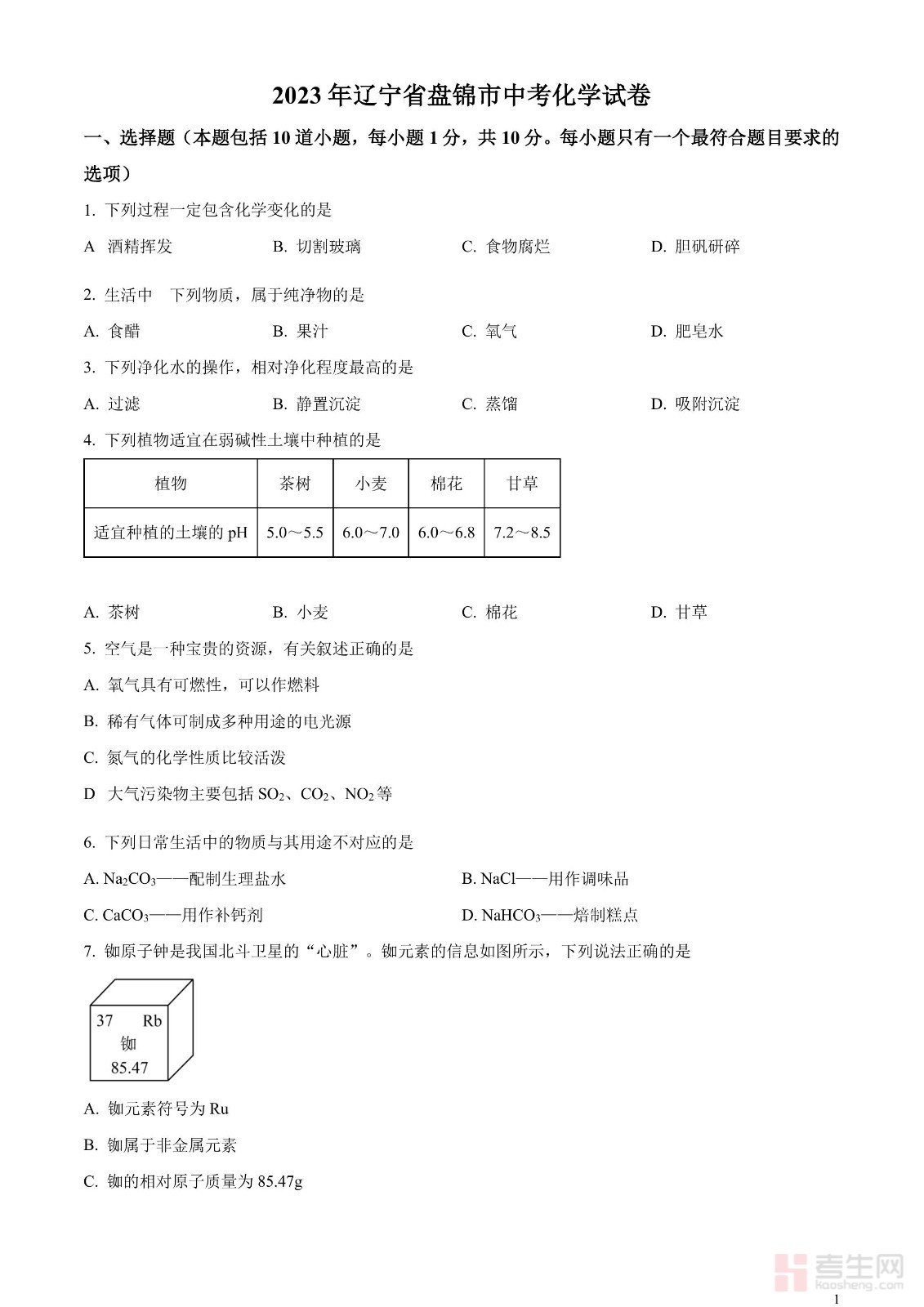 2023年辽宁省盘锦市中考化学真题(原卷版)