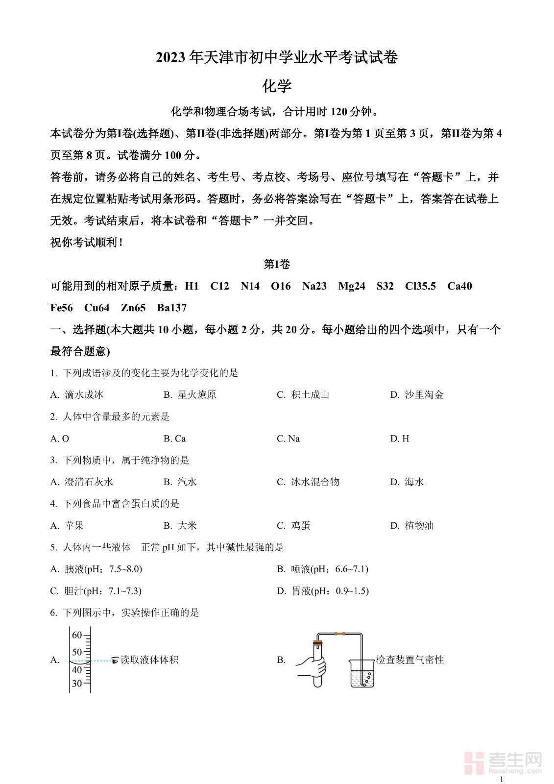 2023年天津市中考化学真题(原卷版)