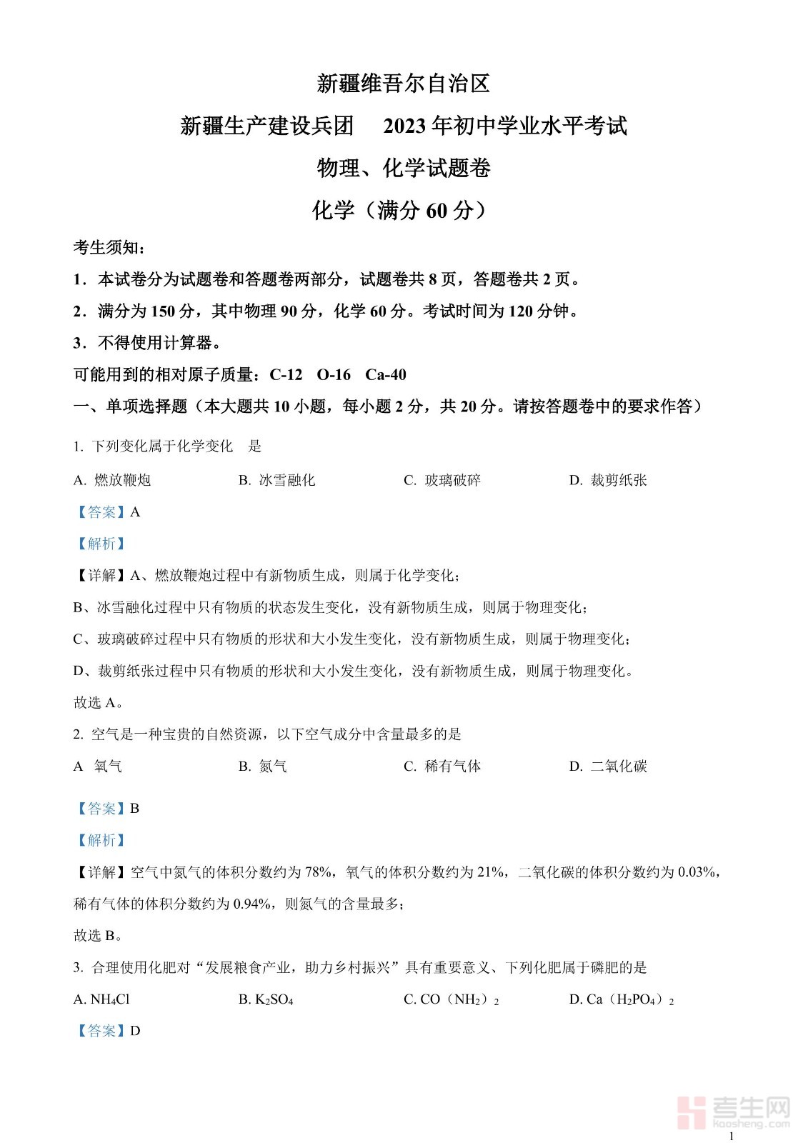 2023年新疆中考化学真题(解析版)