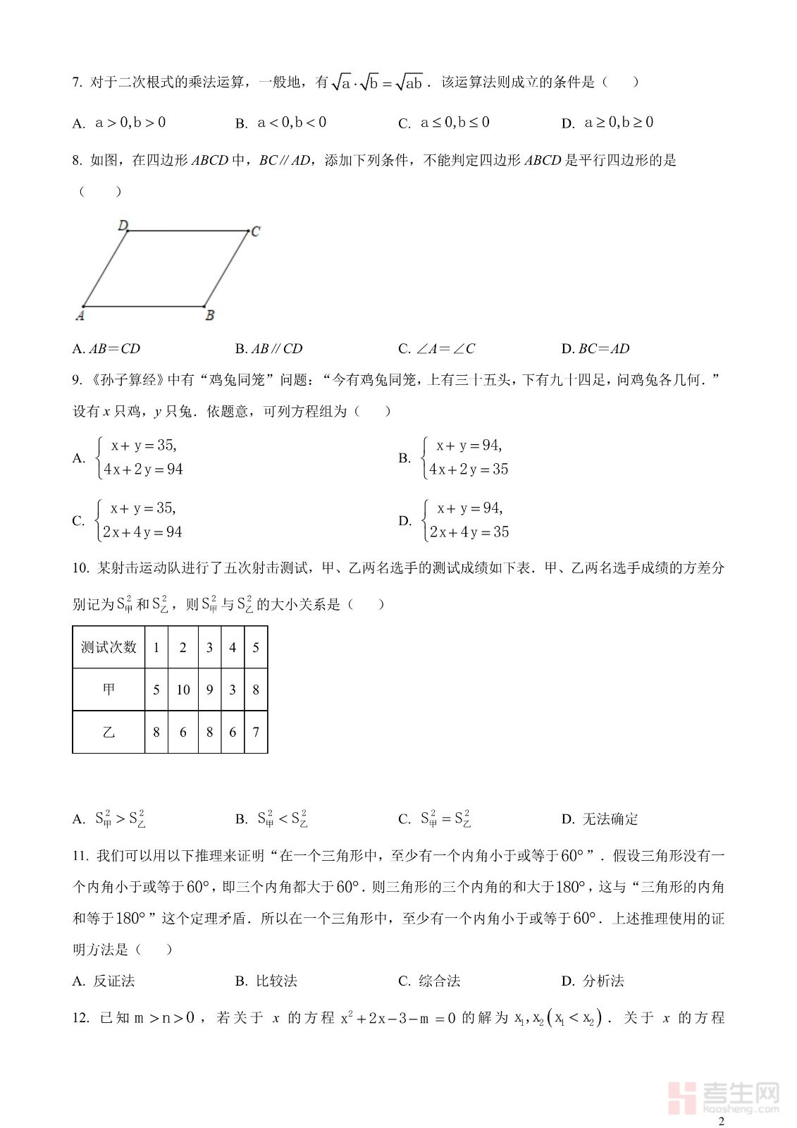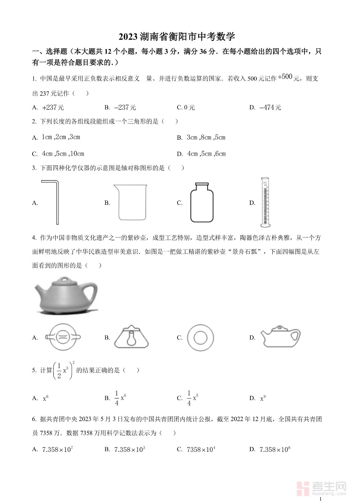 2023年湖南省衡阳市中考数学真题(原卷版)